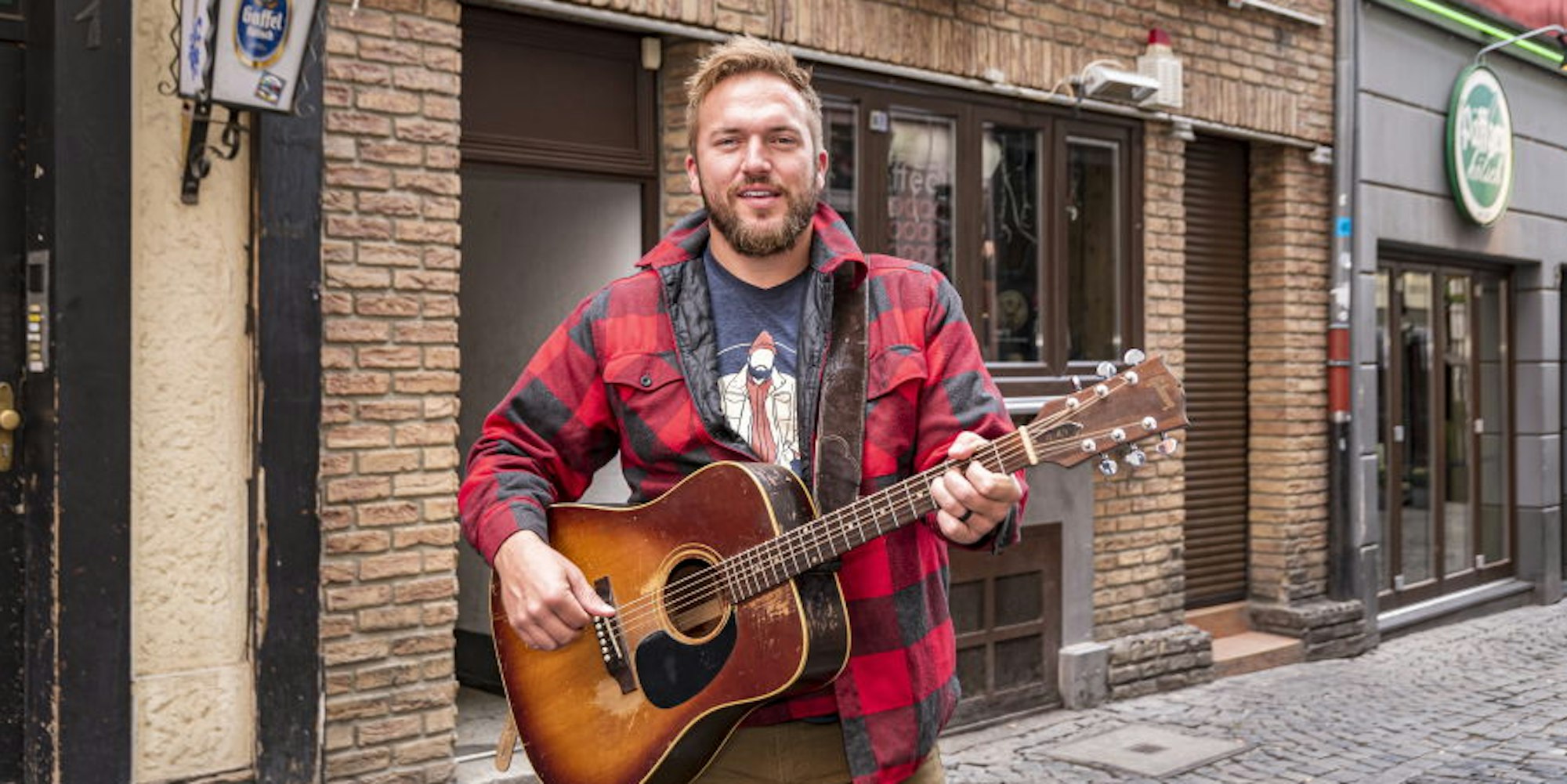 Country-Sänger Logan Mize mit seiner Gitarre unterwegs in der Altstadt