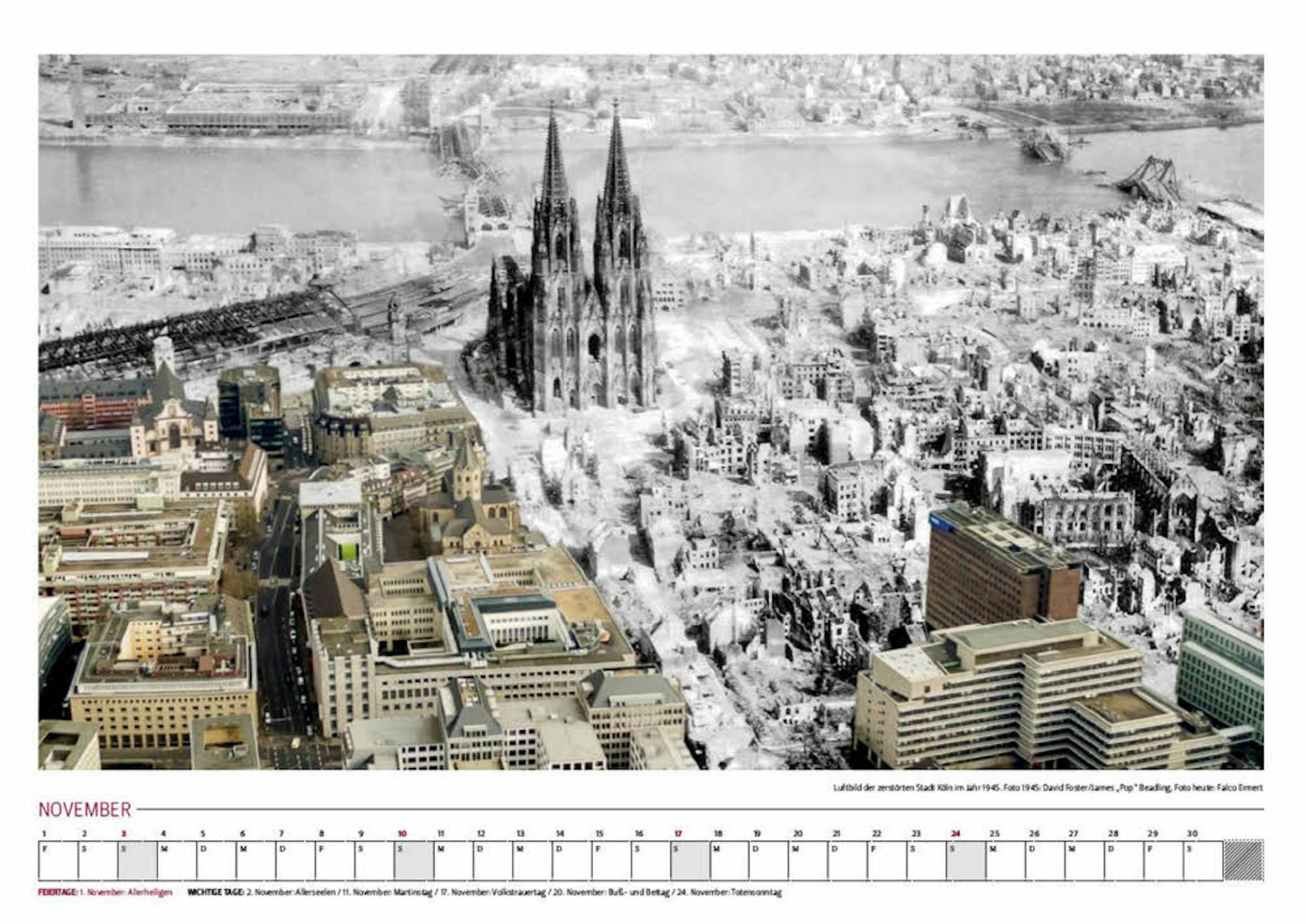 Der Kalender montiert Teile der heutigen Innenstadt ins weltkriegszerstörte Köln.