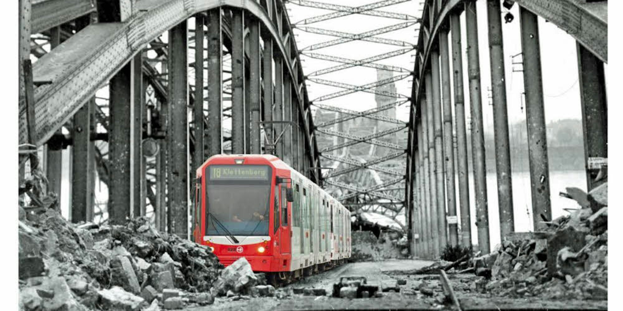 Köln – Schutt liegt auf der stark beschädigten Hohenzollernbrücke, doch auf ihr fährt eine moderne Stadtbahn der KVB. Die Komödienstraße bei St. Andreas präsentiert sich rechts so, wie sie heutzutage aussieht, doch links sind ein Alliierten-Panzer und Soldaten zu sehen. Der Blaubach ist ebenfalls zweigeteilt: Auf der einen Seite steht eine Hausruine, auf der anderen ein intaktes modernes Gebäude.