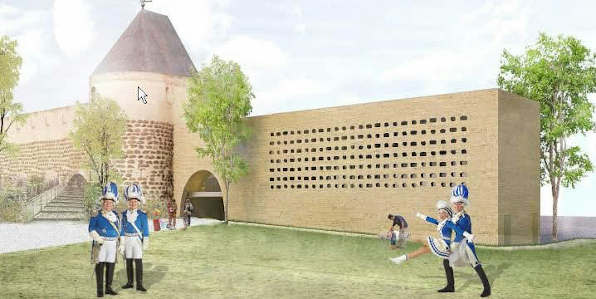 Das Büro Anderhalten Architekten aus Berlin hatte sich in einem Wettbewerb mit der Idee durchgesetzt, die rechts des Sachsenturms abgerissene historische Stadtmauer durch eine moderne Variante zu ersetzen. So soll aus der Perspektive des Sachsenrings der Eindruck einer geschlossenen Mauer entstehen, in der sich eine Pforte für den öffentlichen Fußpfad Blaue-Funken-Weg befindet. Auf der zum Kartäuserwall gelegenen Rückseite sollen zwei neue Festsäle als Anbauten sichtbar sein.