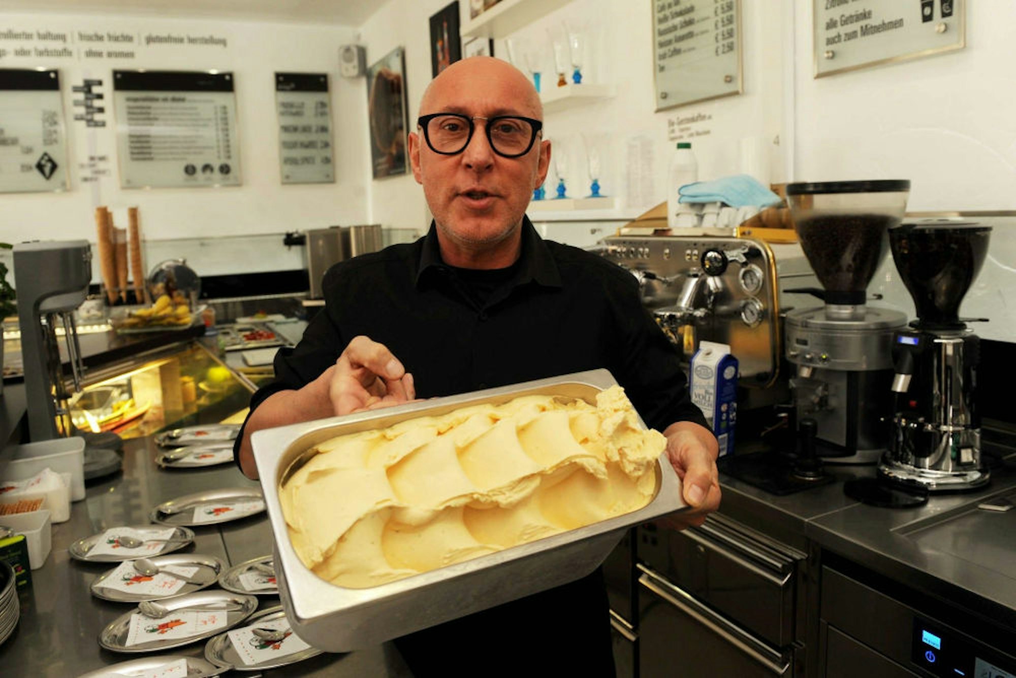 Dabei hatte der Gelatiere sein Geschäft erst Ende Februar wieder aufgemacht – nach einer Abwesenheit von mehreren Monaten, weil er lungenkrank ist und seit Jahren an allergischem Asthma leidet. Sein Gewicht war vergangenes Jahr auf 42 Kilo abgesackt, nun wiege er glücklicherweise wieder 60 Kilo. „Ich habe aber keine Panik. Jetzt habe ich wieder Kraft, letztes Jahr war es viel schlimmer. Außerdem habe ich mir nun zwei Partner dazu geholt, ich stehe selbst maximal zwei Stunden an der Theke.“