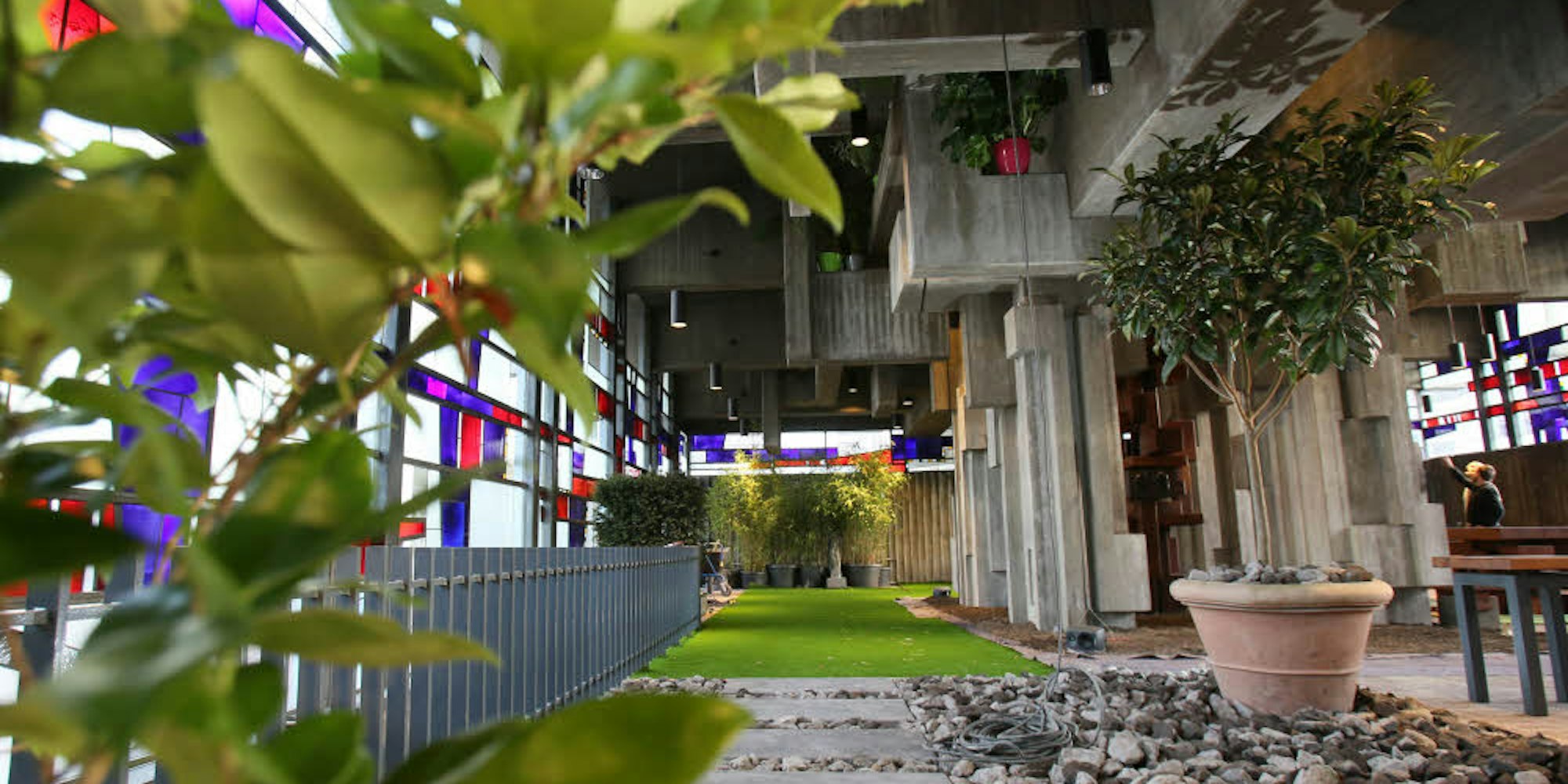 Eine weitere Kirche dürfte im Rahmen von Design/18/12 mit einem Highlight aufwarten: „Garten Eden 3.0“ nennt sich das Werk, das die Gartenmanufaktur Schmidt in der kubistisch anmutenden Betonarchitektur der Kirche Johannes XXIII. (Berrenrather Straße 127) installiert hat. Zugleich wird dort unter dem Motto „Wandeln auf wandelbarem Glück“ ein farbiges Mosaik aus zusammensteckbaren Schafwollteppich-Modulen zu sehen sein. Das Konzept stammt von dem schwedischen Floristen Per Benjamin.