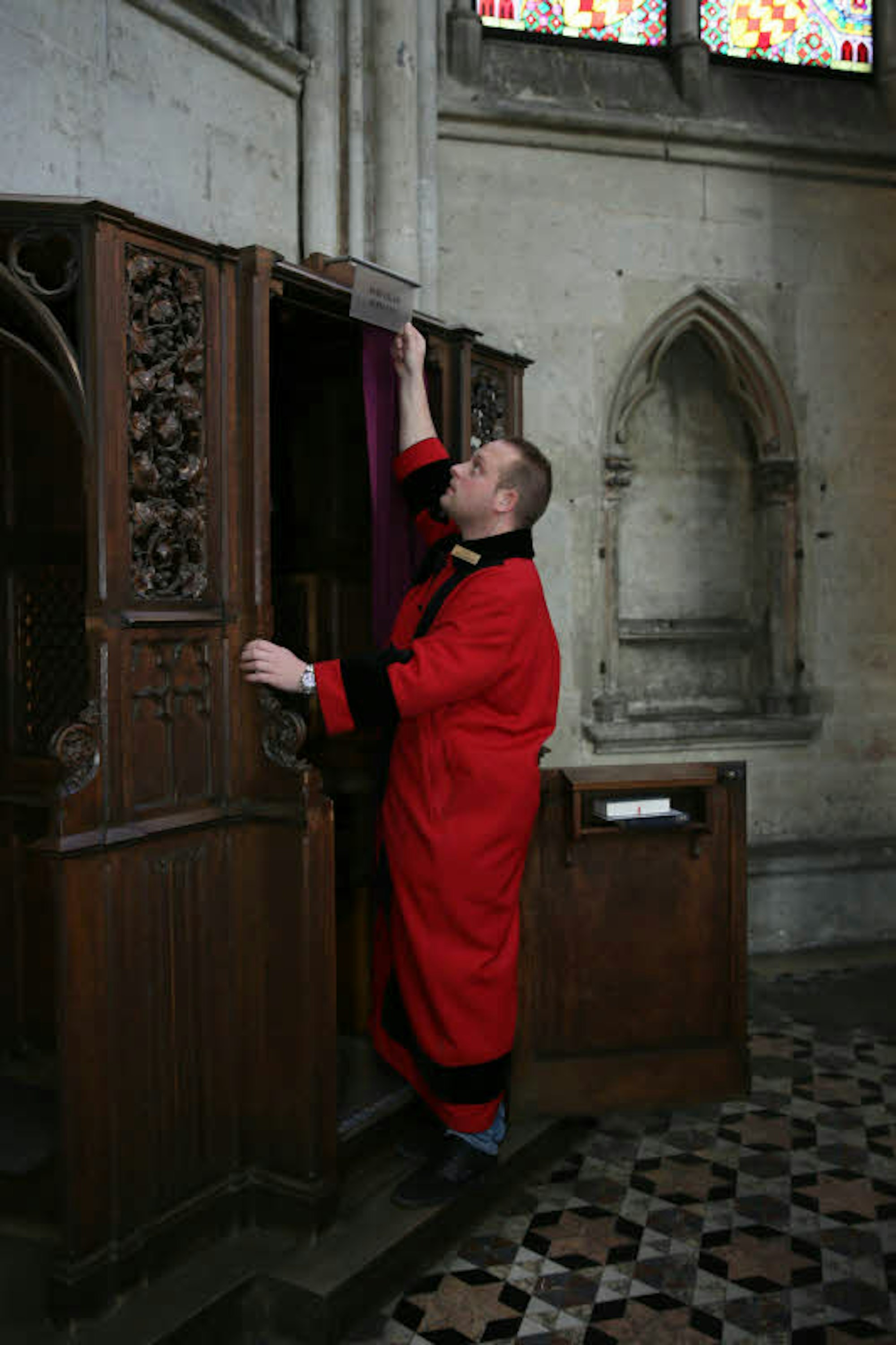 Cay Schloemer bringt vor der Beichte am Beichtstuhl das Namensschild des Seelsorgers an.