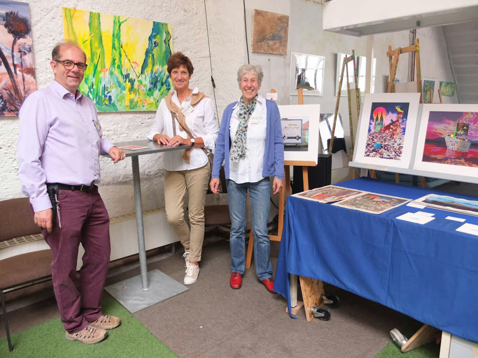 Herbert Kalter (v.l.), Christa Sanio und Maria Laeplle-Steininger von Terre des Hommes mit einem Teil der gestifteten Kunstwerke.
