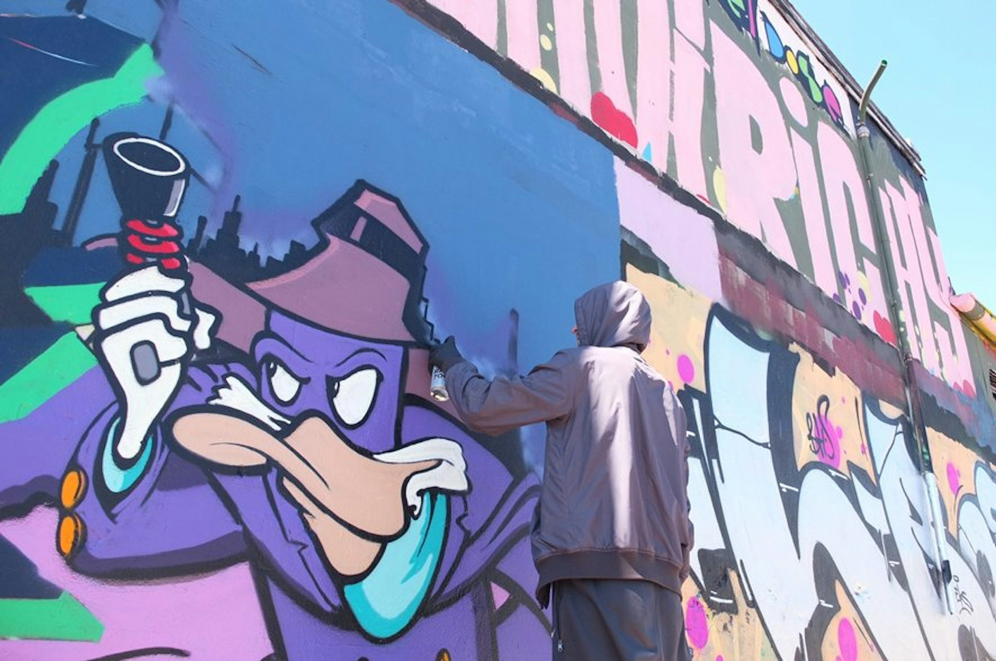Köln-Ehrenfeld – Darkwing Duck schaut grimmig und zückt seine Allzweckpistole, mit der er wahlweise Kletterseile, Netze oder auch Rauchpatronen verschießen kann. Der Comic-Superheld ist Teil einer – legalen – Graffiticollage an der Rückseite des Konzertlokals „Underground“. So ziemlich jede Wand ist hier mit Sprayerwerken verziert.