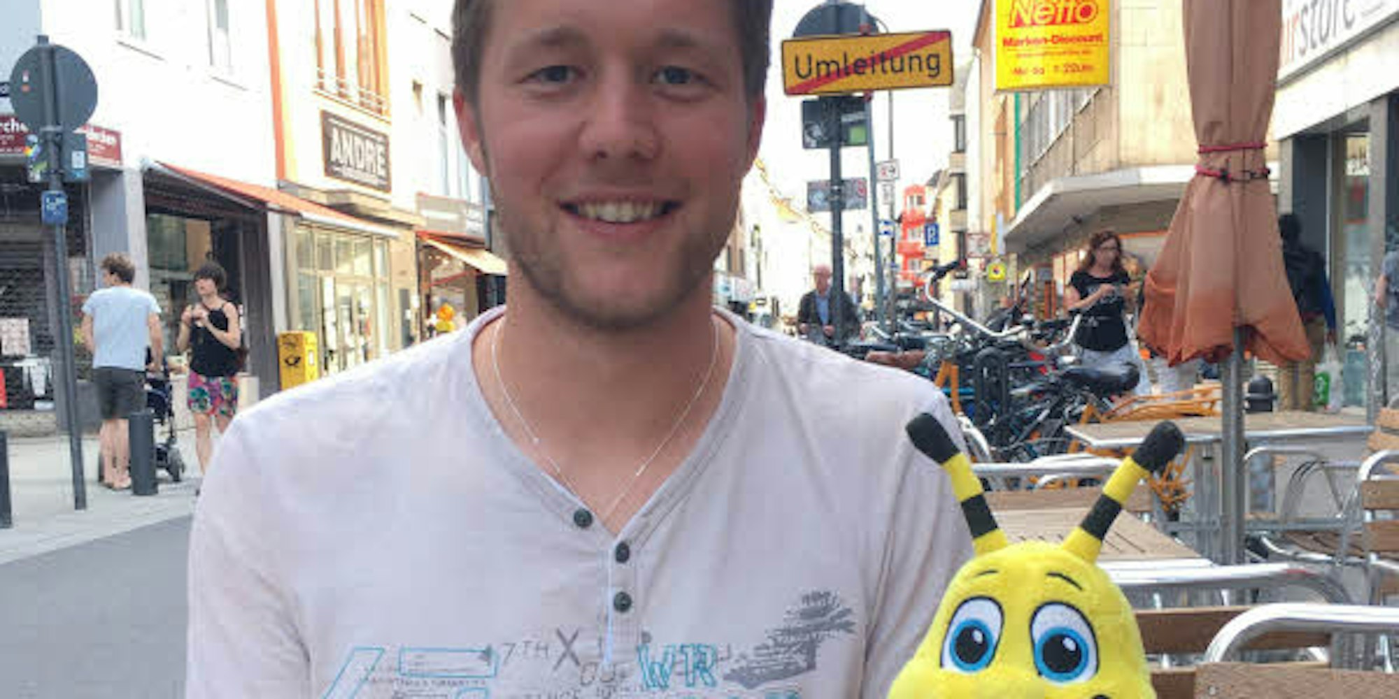 Ich begegne dem 29-Jährigen auf der Severinstraße. Da er ein aus Kölner Sicht suboptimales Accessoire mit sich herumträgt, springt er mir sofort ins Auge, und ich freue mich, dass er sich die Zeit nimmt, mir das Neueste aus seinem Leben zu erzählen. So viel sei schon verraten: das Neueste heißt Felix, ist 53 Zentimeter lang und wiegt knapp 5000 Gramm.