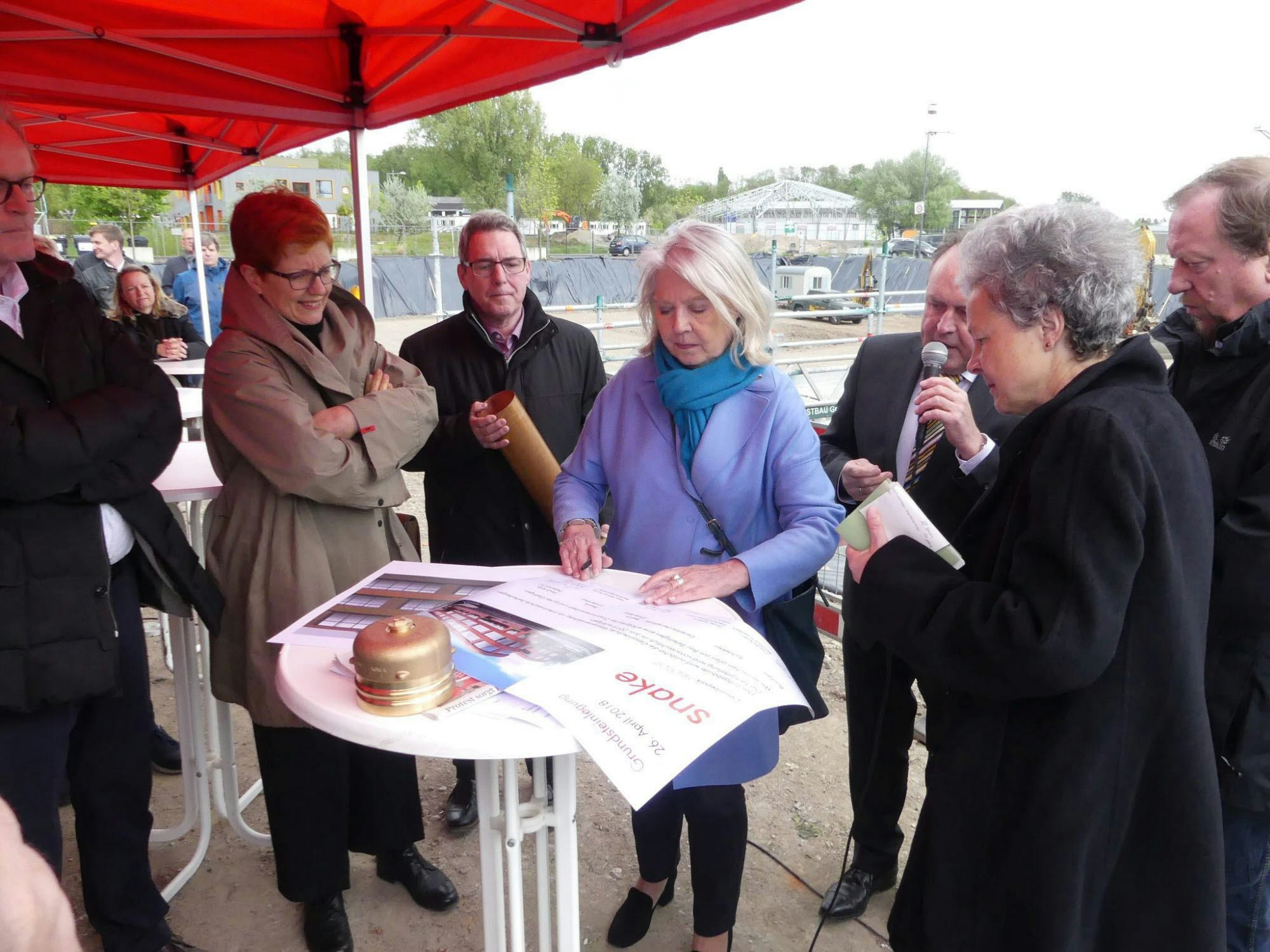 Zusammen mit den beiden Politikern legten Schuldezernentin Agnes Klein und Bauunternehmer Anton Bausinger den Grundstein für das Gebäude, das schon im kommenden Sommer bezugsfertig sein soll und vom Schuljahr 2019/20 an für fünf Jahre eine neue Gesamtschule aufnehmen soll.