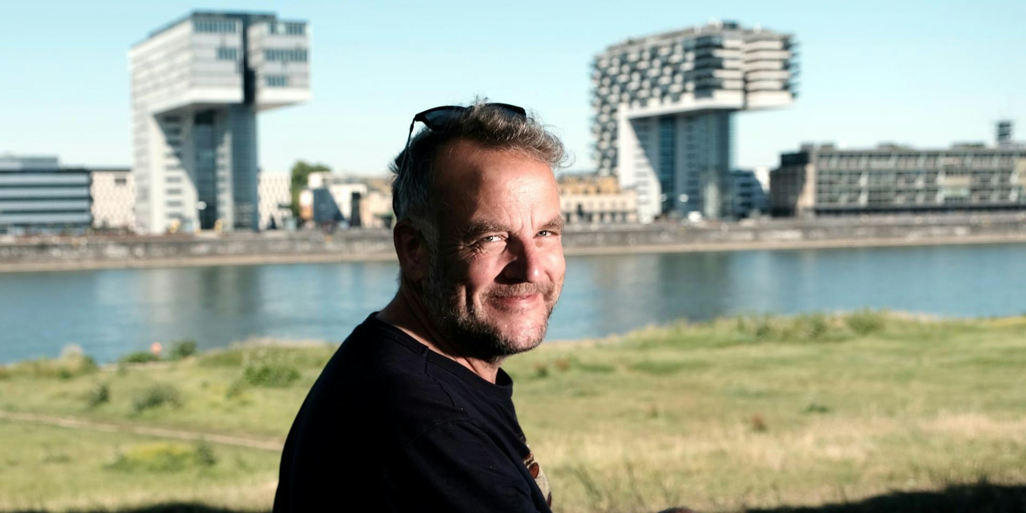 Sänger Daniel Dickopf vor den Kranhäusern am Rhein