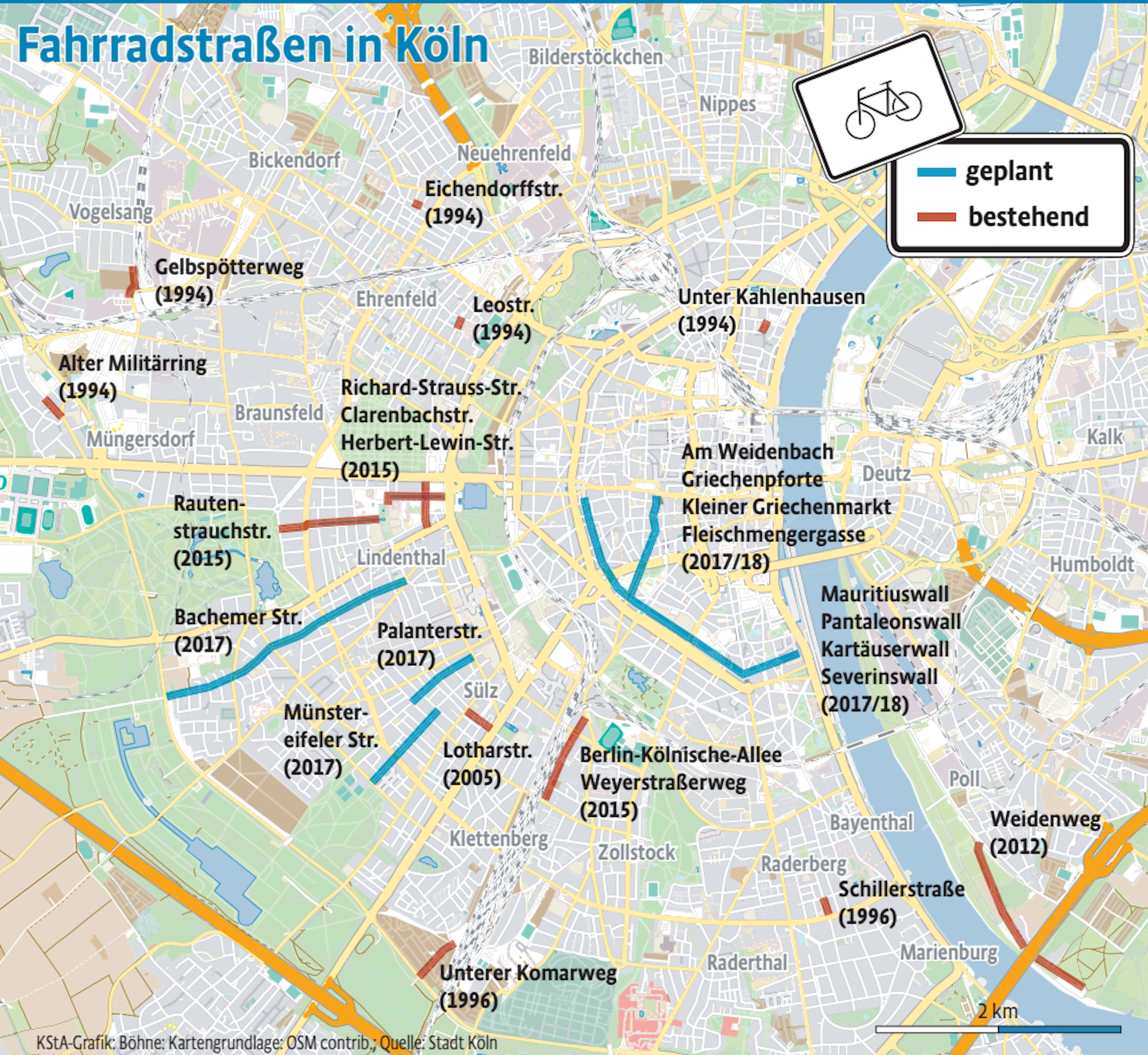 Die erste wurde 1993 in Höhenhaus eingerichtet. Der Johannesweg ist seitdem eine Fahrradstraße. Es folgten aber noch weitere sieben in den 1990er Jahren, unter anderem in Lindenthal und Ehrenfeld (siehe Karte). 2012 folgte der Weidenweg in Poll. Drei Jahre später richtete die Stadt in Lindenthal im Rahmen des Radverkehrskonzepts weitere sieben Fahrradstraßen ein. Noch in diesem Jahr sollen drei weitere Fahrradstraßen in Lindenthal folgen. Zudem will die Stadt in der City 2017 und 2018 zwei neue Achsen einrichten.