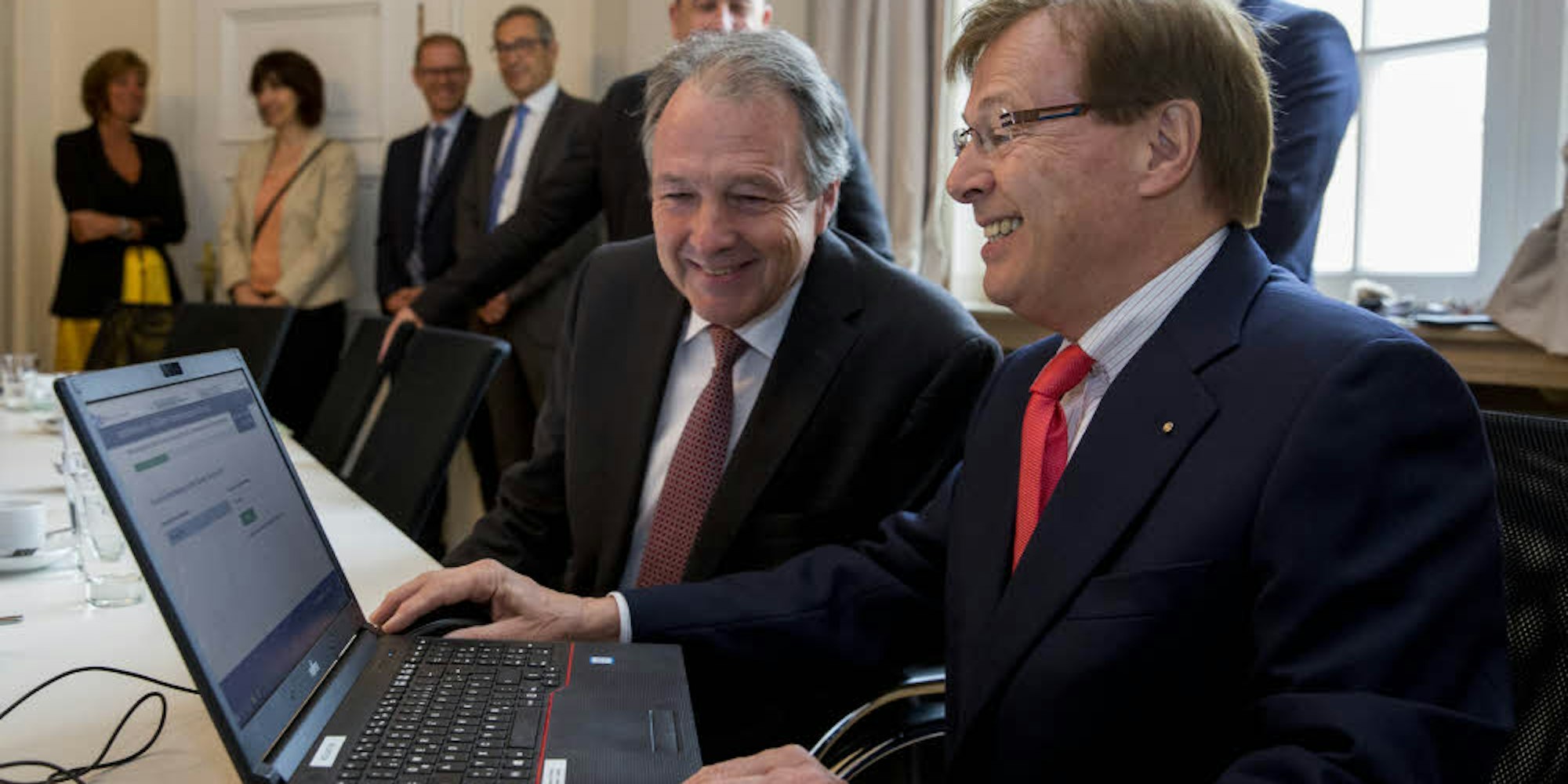 NRW-Justizminister Peter Biesenbach (r.) und Amtsgerichtspräsident Henning Banke starten den Pilotbetrieb beim Amtsgericht Köln.
