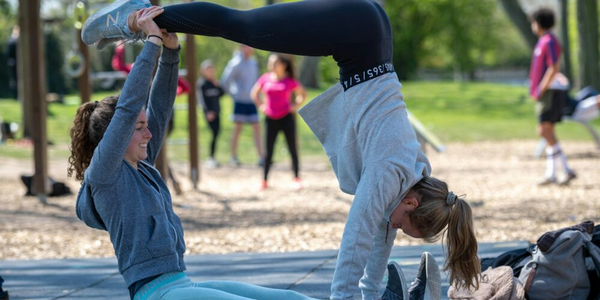 Köln – Eine Joggerin in T-Shirt und kurzer Hose wird langsamer, als sie am Trimm-Parcours im Inneren Grüngürtel entlangläuft, bis sie ganz anhält. Der Air-Walker ist eines der wenigen freien Geräte, sie steigt auf die freischwebenden Metallplatten, und pendelt mit ihren Beinen in der Luft hin und her. Ihr gegenüber hängt ein junger Mann an Ringen, auf dem Trampolin springen zwei Kinder umher und auf dem Fitnessboden macht ein Jugendlicher Liegestütze.
