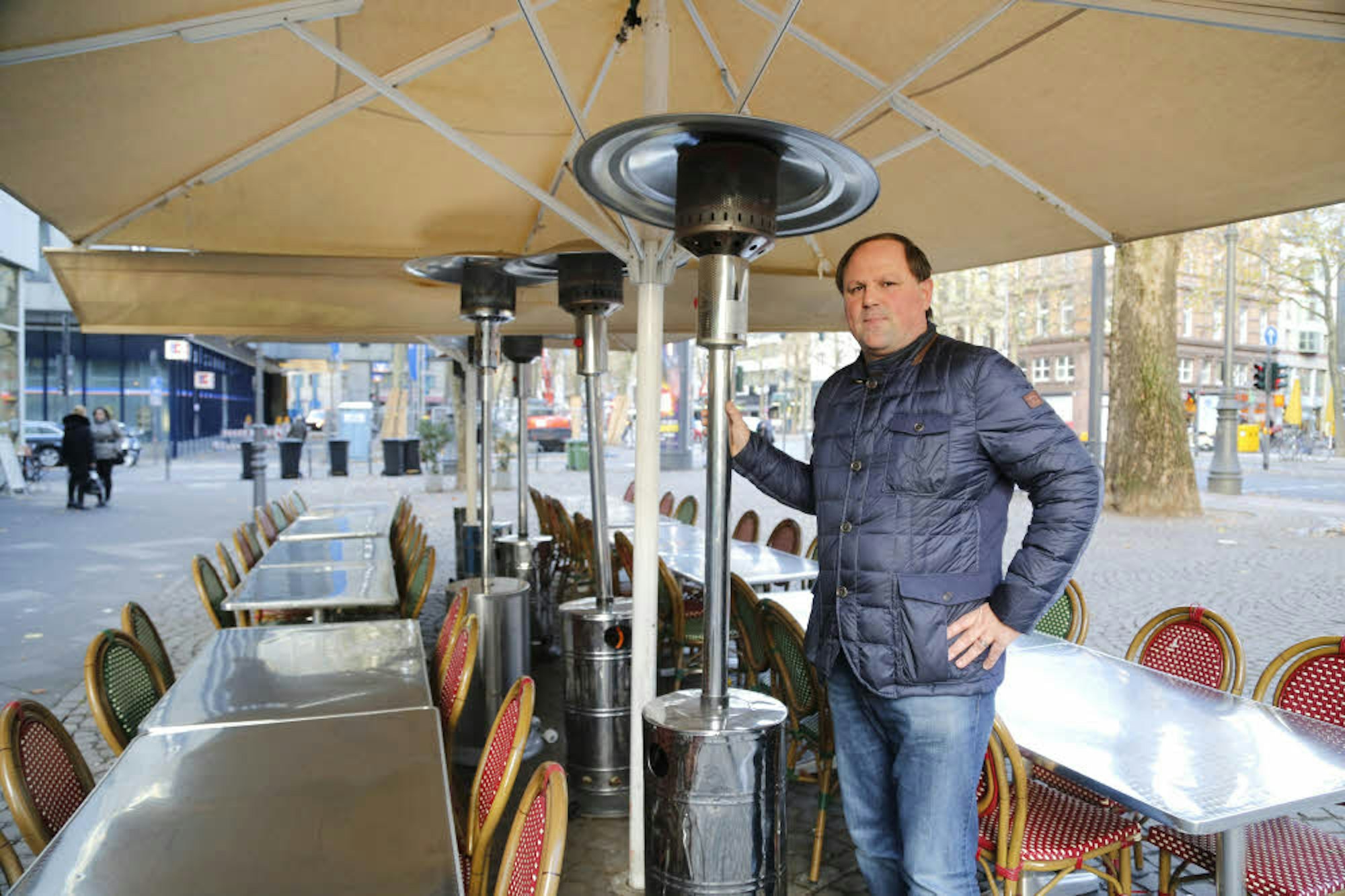 Dragan Gribisic mit Heizpilzen vor seinem Lokal am Hohenzollernring