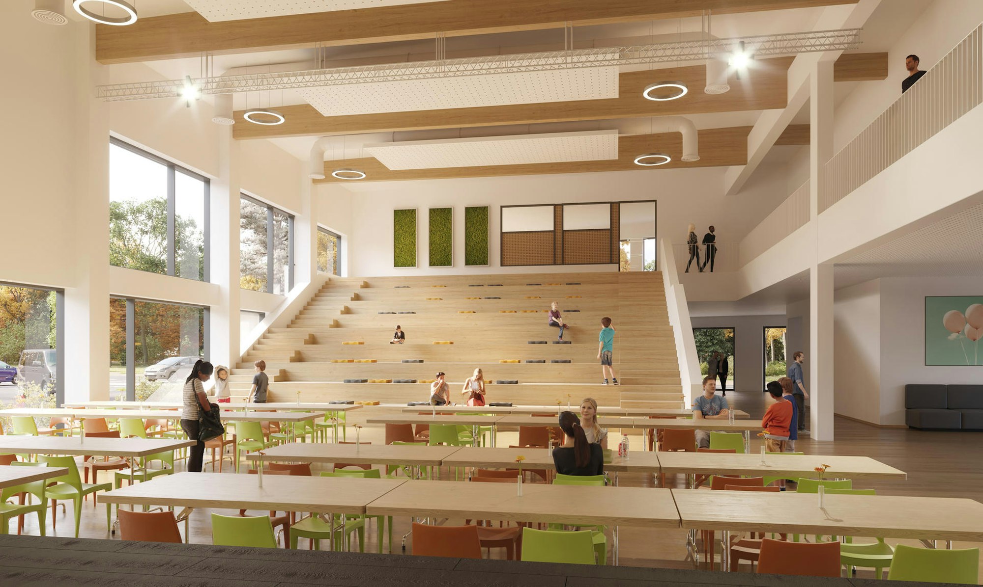 Viele der Anforderungen, die die Schüler formuliert haben, finden sich in der Planung wieder. So stand auf der Wunschliste des Nachwuchses ein Schulhof mit vielen großen Bäumen. Die Architekten von Vollack werden darum den alten Baumbestand auf dem Grundstück in ihr Konzept integrieren, sodass die Schüler künftig ihren Schulwald als Spielplatz oder Klassenraum im Freien nutzen können. Den Wunsch der älteren Schüler nach Begegnungsräumen wird eine Sitztreppenanlage im Bereich von Aula und Mensa erfüllen.