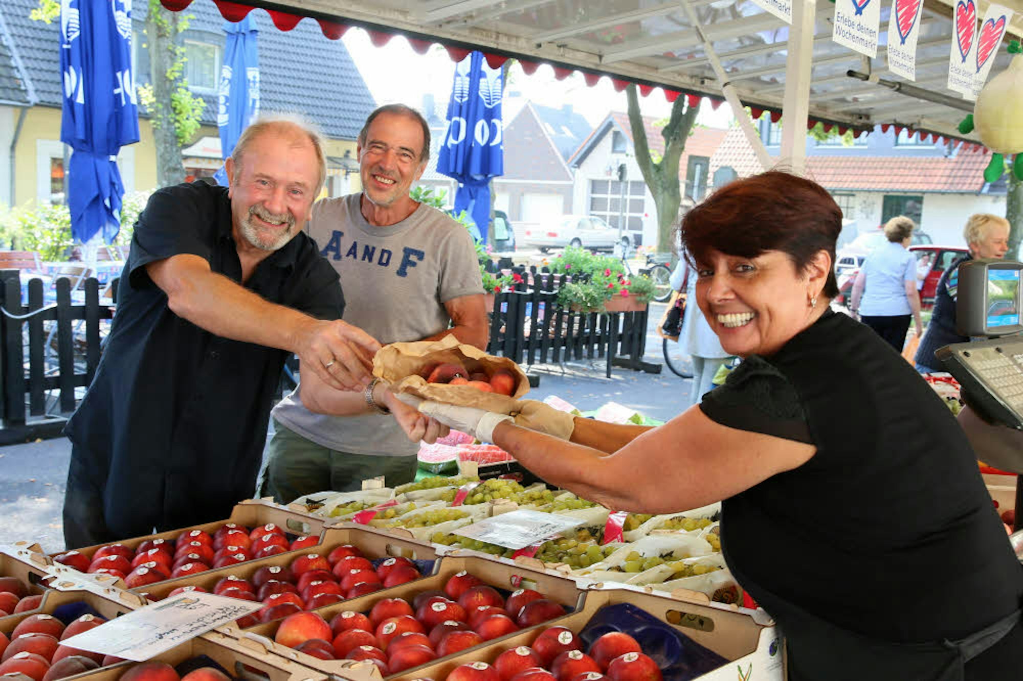 Biggi Fischer verkauft Fritz Schopps Plattpfirsiche.
