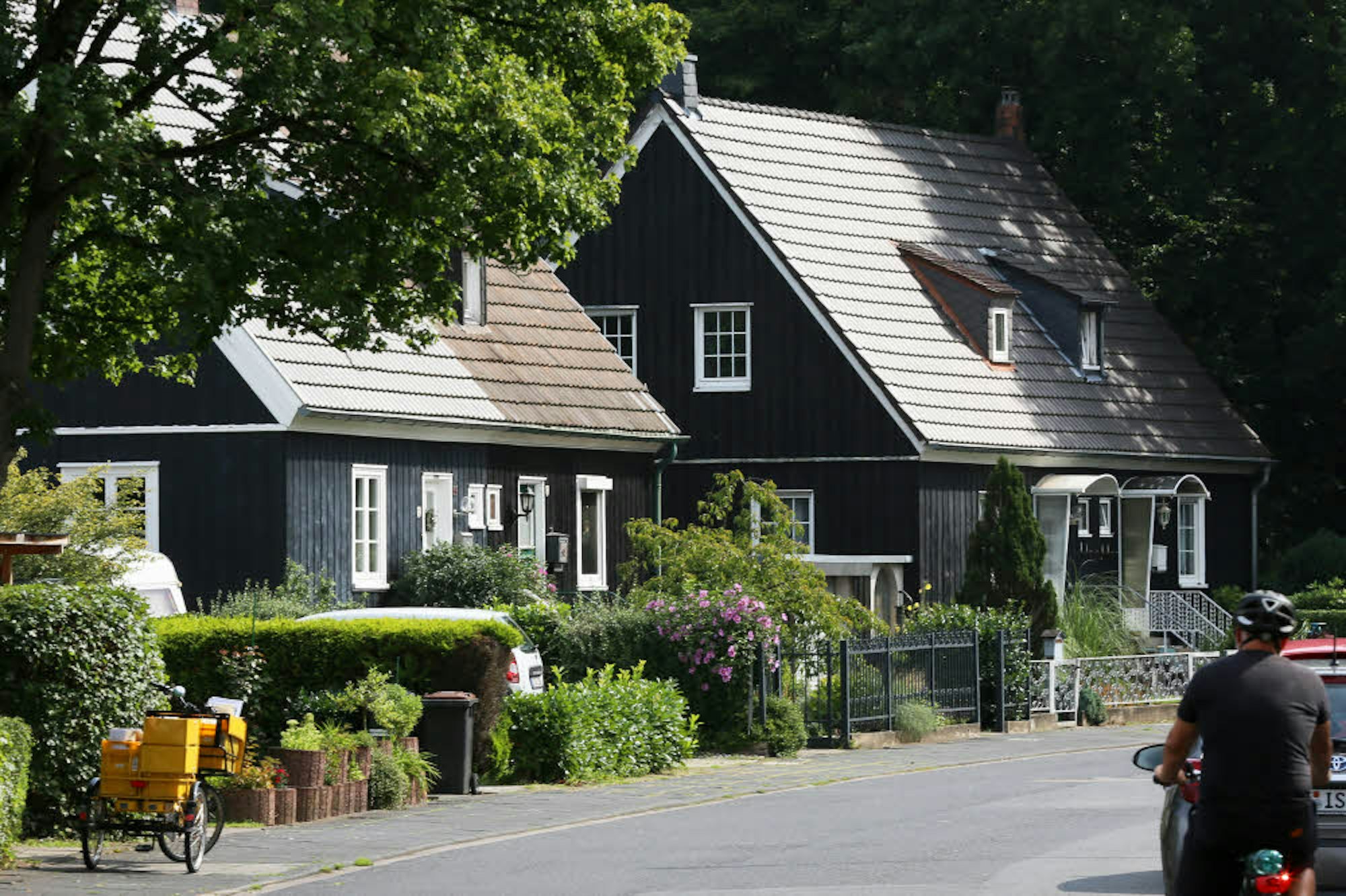 Malerisch sieht die Siedlung aus. Dunkle Holzhäuser stehen hinter akkurat gestutzten Hecken, die weißen Umrandungen der Fenster leuchten in der Sonne. Die mehr als 70 denkmalgeschützten Doppelhäuser könnten genauso gut als Kulisse für einen Inga-Lindström-Film dienen.