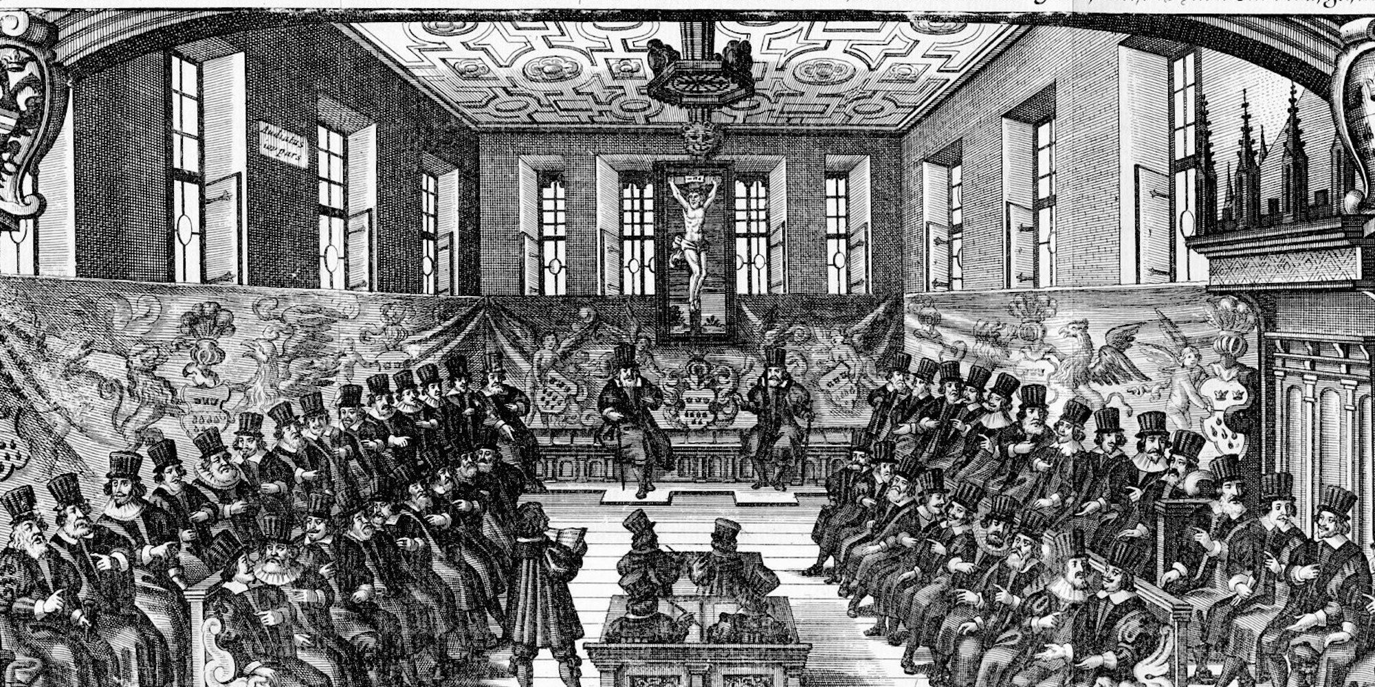 Als noch „hochweise und hochedle“ Männer das Regiment in Köln ausübten: die Ratsherren in ihrem Habit im Rathaus (Kupferstich aus dem Jahre 1655).