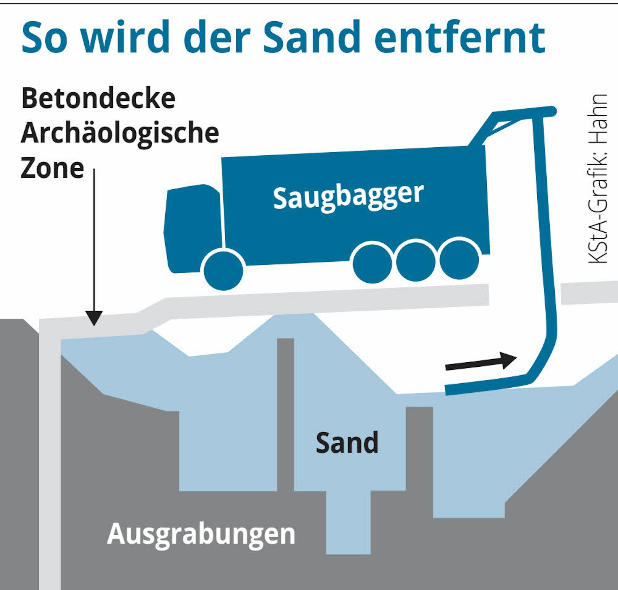 Vor der Verfüllung mit Sand waren die Ausgrabungen mit Schutzplanen abgedeckt worden. Mittlerweile ist über der ganzen Fläche eine Decke betoniert worden. Jetzt soll der Sand mit Hilfe moderner Saugbagger schrittweise entfernt werden.