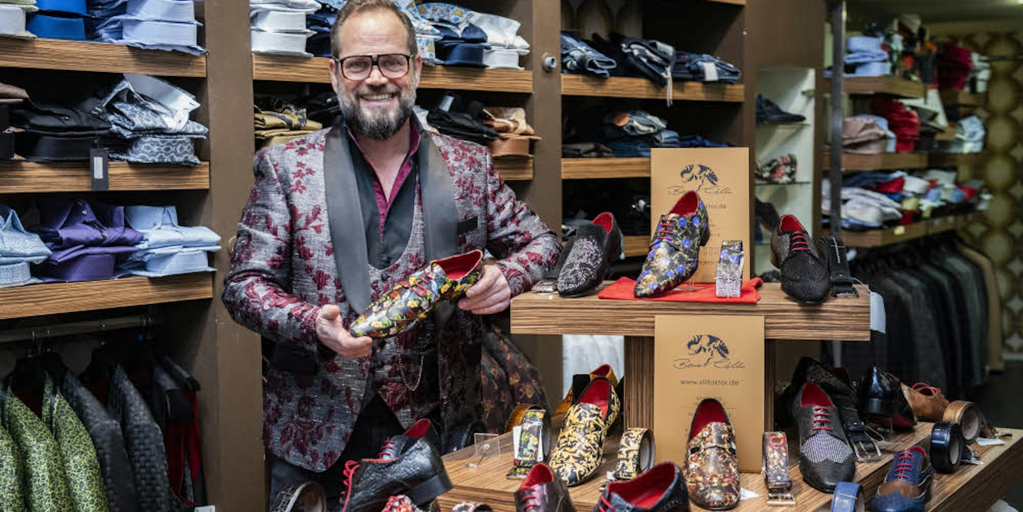 Bernert möchte bewusst nicht als „Herrenausstatter“ fungieren, weil das in seinen Ohren verstaubt und gestrig klingt. Er verleihe Herren ein Gefühl, welches sie woanders nicht bekämen. Woanders, das ist dort, wo Männerschuhe im Wesentlichen braun oder schwarz sind. In Bernerts Herrenladen sind die Schuhe mitunter so bunt, dass manchem Mannsbild bei der Erstbetrachtung ein konsterniertes „Oh!“ entfleucht. Bei anderen Herren klingt das Oh indes fünfvokalig und sehr begeistert. Es sind Männer wie Guido Cantz, denen man nicht mehr erklären muss, dass die Zeiten vorbei sind, in denen Brokatmuster allenfalls eine Berechtigung auf Omas Sofakissen hatten.