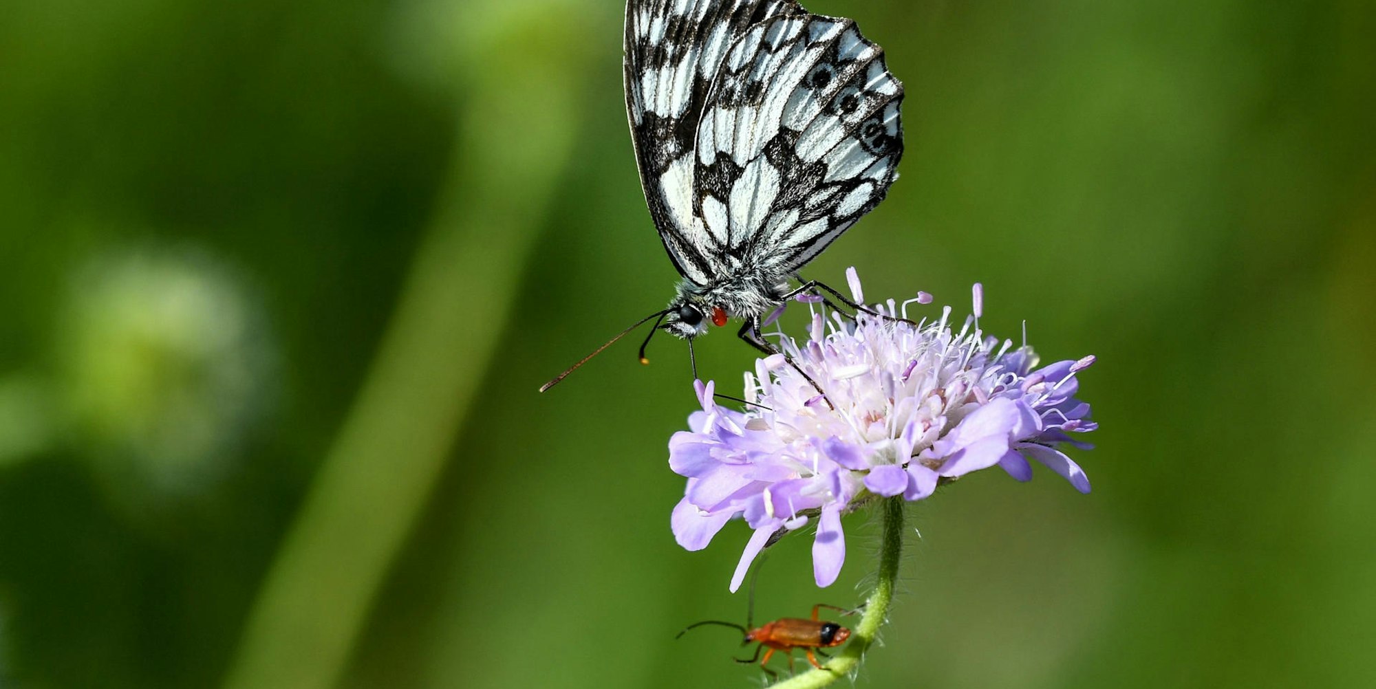 Ein auffällig gemusterter Schachbrettfalter sitzt auf einer Blume. Das Insekt wurde 2019 zum „Schmetterling des Jahres“ gewählt.