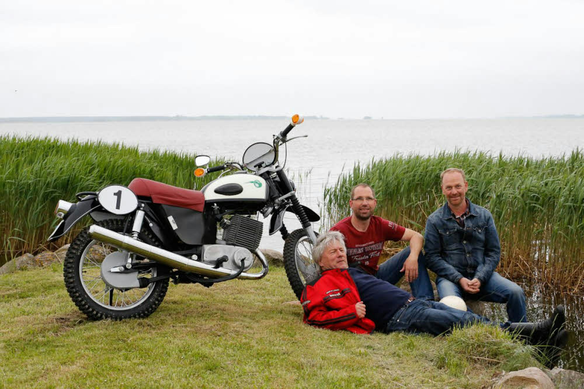 Jürgen Becker mit den Brüdern Krull, die sein Motorrad gebaut haben.