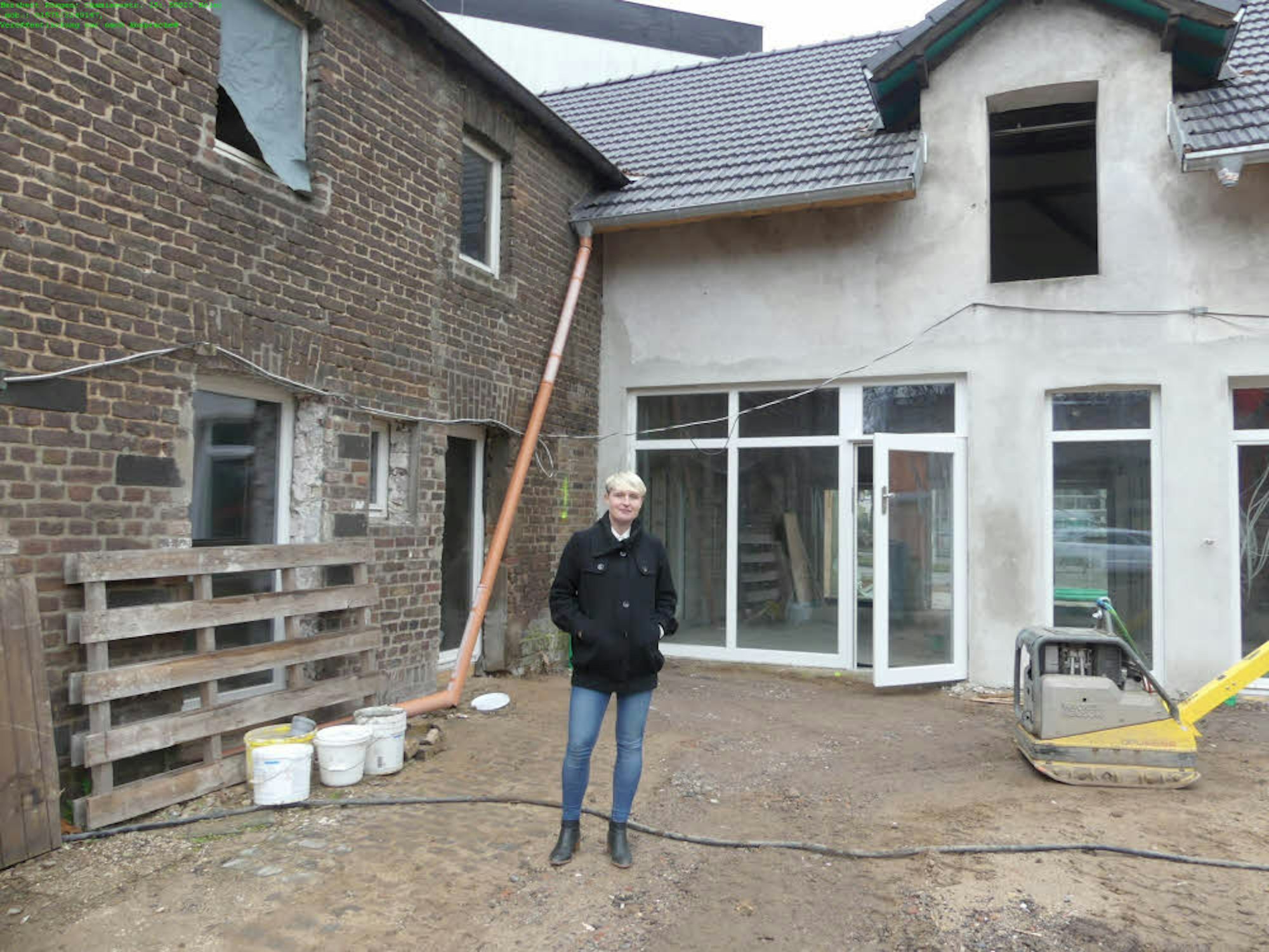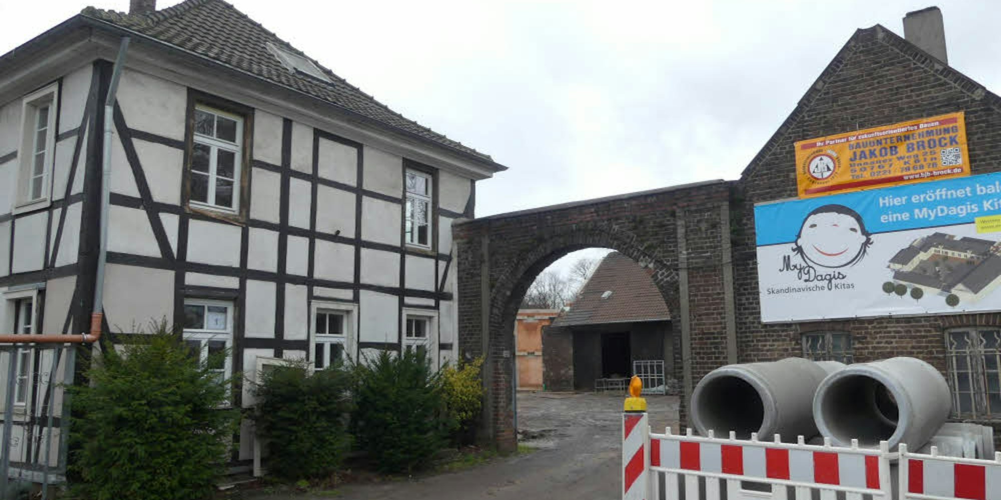 Geschäftsführerin Stefanie König steht zwischen dem Altbau und einem Sandhaufen im Innenhof: "Hier kommt einmal die Verwaltung hin und dort werden die Gruppenräume sein", erklärt sie und deutet zuerst auf das in Fachwerk-Bauweise errichtete Haupthaus und anschließend auf die angrenzenden ehemaligen Stallungen. In einer zweiten Ausbaustufe wird zwischen dem früheren Stallgebäude und der ehemaligen Scheune ein quaderförmiger Anbau mit einer Gymnastikhalle errichtet.