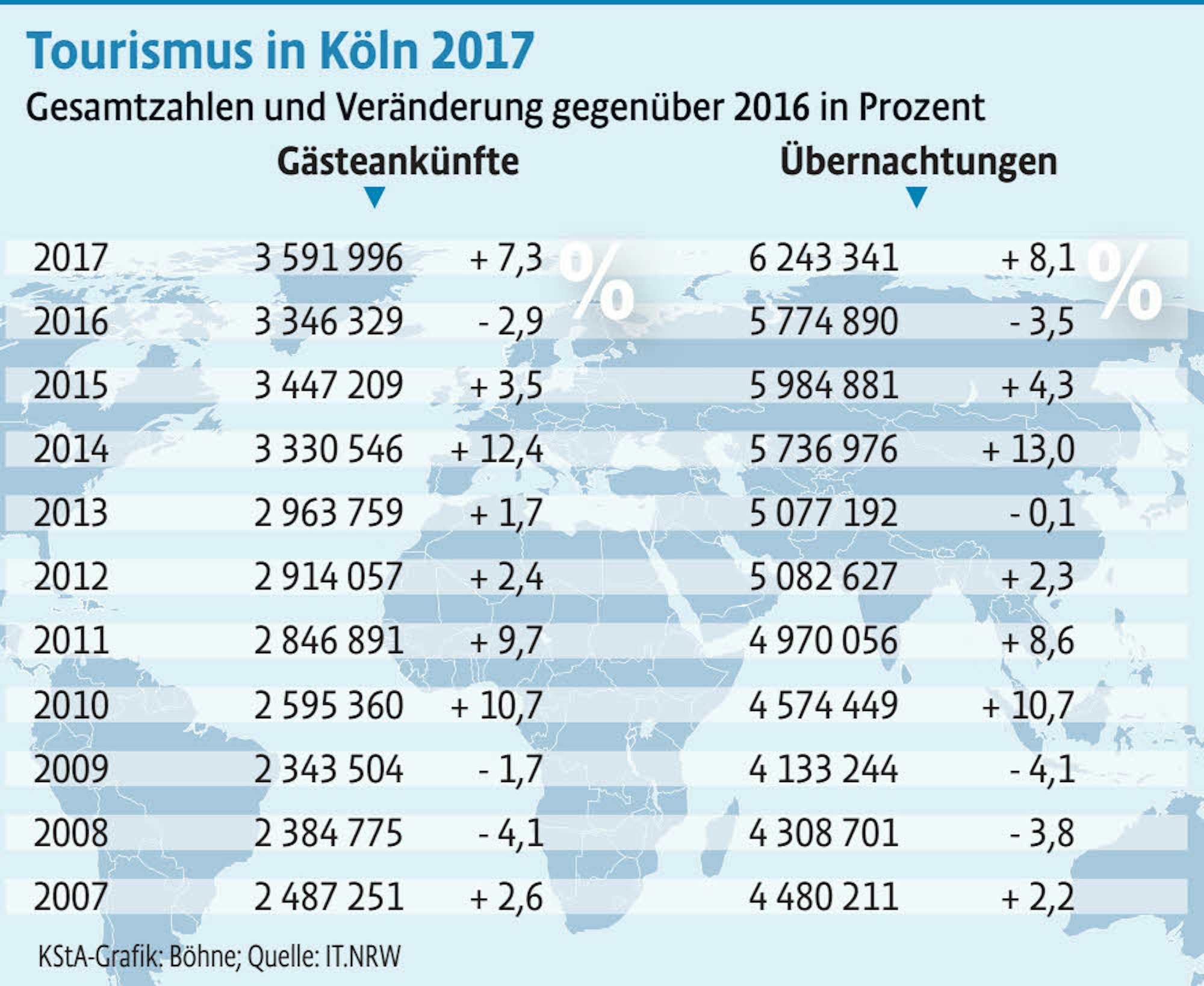 „2017 hat sich im Vergleich zu den Vorjahren zu einem Rekordjahr entwickelt“, sagte der Geschäftsführer von Köln-Tourismus, Josef Sommer, bei der Präsentation der neuen Bilanz. Mit 6,24 Millionen Übernachtungen waren es 8,1 Prozent mehr als 2016. Auch bei den Ankünften gab es mit 3,59 Millionen Gästen ein Plus von 7,3 Prozent.