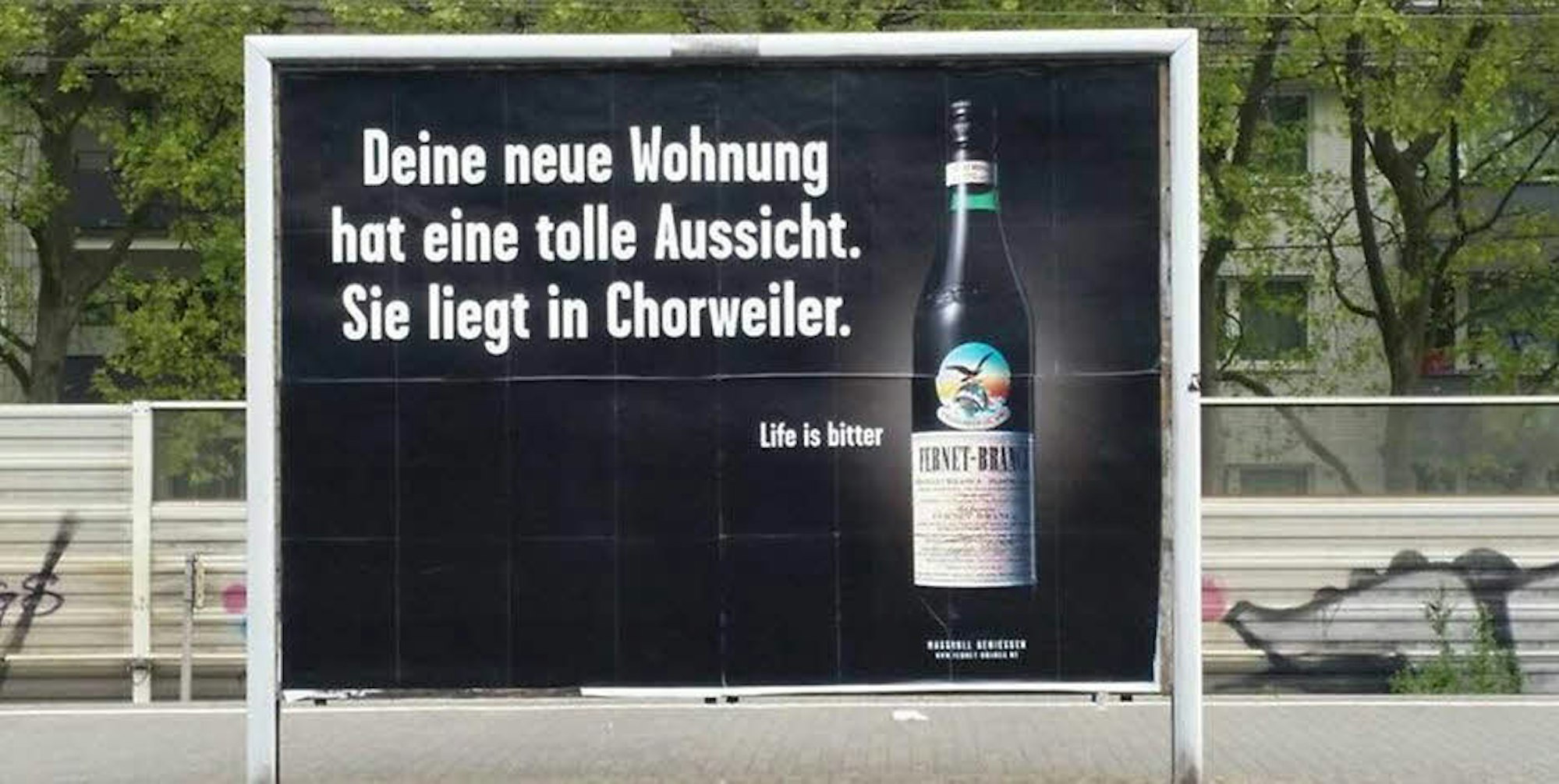 Köln – „Deine neue Wohnung hat eine tolle Aussicht. Sie liegt in Chorweiler. Life is bitter – das Leben ist bitter.“ Mit diesem Text auf großformatigen Plakaten – der erste Satz unverkennbar ironisch gemeint – treten die Werber der Kampagne für den Magenbitter „Fernet Branca“ seit mehreren Monaten dem Kölner Norden kräftig auf die Füße.