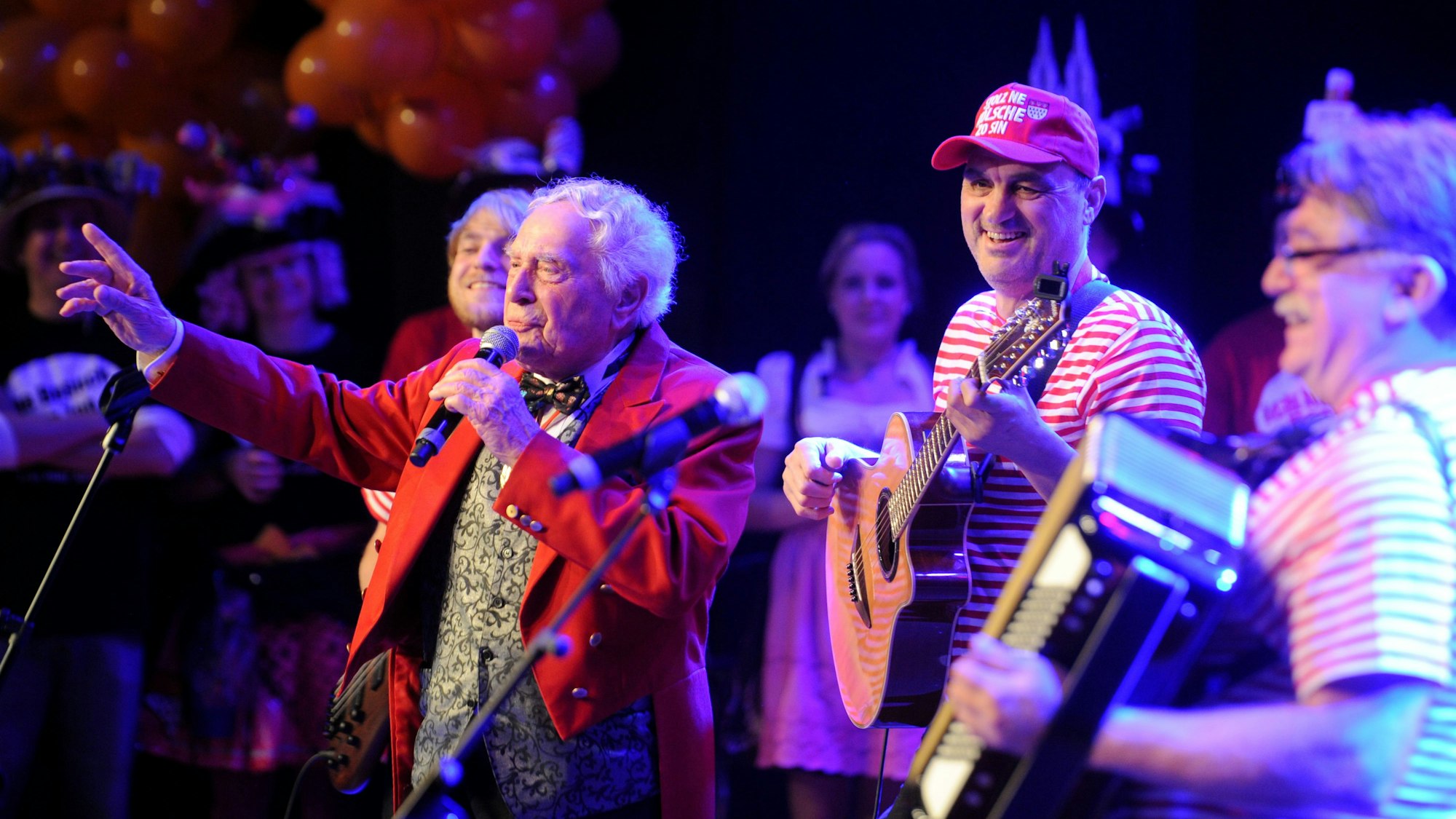 Ludwig Sebus im Jahr 2015 auf der Bühne der „Sitzung von Loss mer singe“ im Theater am Tanzbrunnen, neben ihm „Magic Flönz“ Herbert Schmidt und Rudi Rumstajn