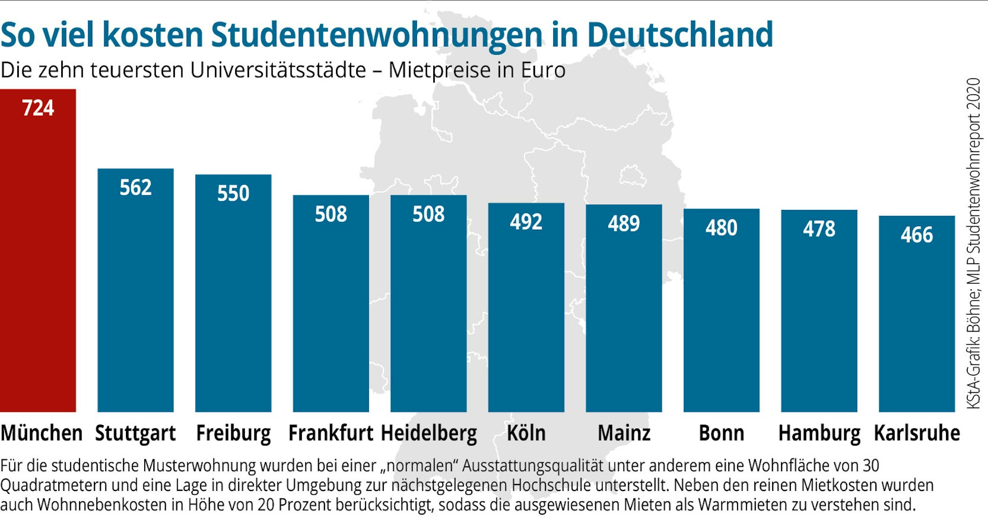 Im Report wurden die Mietpreise für 30 deutsche Hochschulstandorte im Zeitraum von Juni 2019 bis Juni 2020 ausgewertet. „Corona hatte kaum Auswirkungen auf die Mietpreise“, sagte IW-Immobilienexperte Michael Voigtländer. „In den meisten Standorten sind die Preise weiter gestiegen.“ Der teuerste Standort für Studenten bleibt München. Dort kostet die studentische Musterwohnung 724 Euro, darauf folgen Stuttgart (562 Euro), Freiburg (550 Euro), Frankfurt und Heidelberg (jeweils 508 Euro).