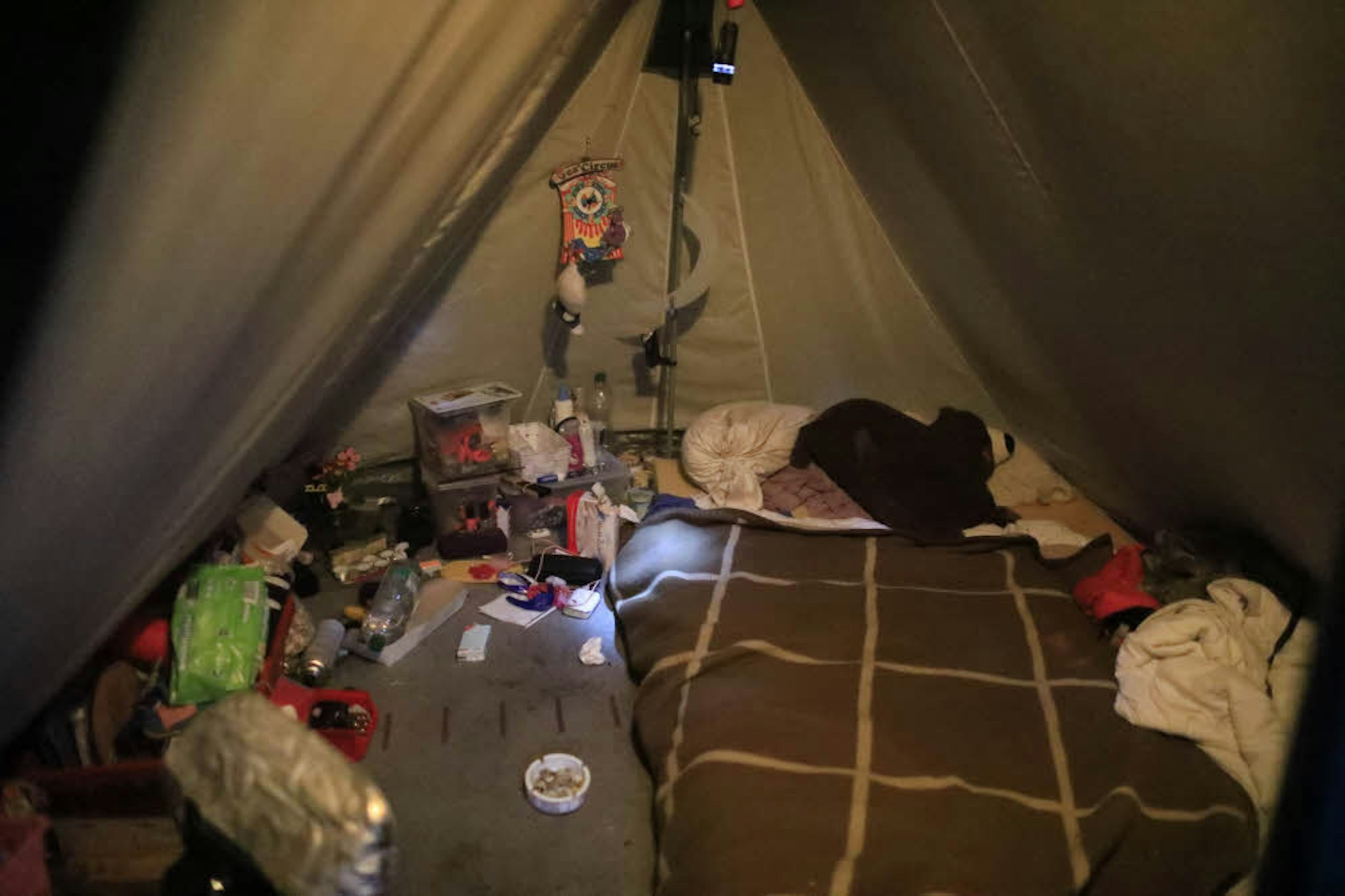Die Gasflasche mit Heizaufsatz, die im Zelt wenigstens etwas Wärme spendet, war plötzlich leer. Im beengten Zelt, wo sich die beiden zwischen Aschenbecher, Klopapierrollen, Milchpackungen und leeren Fastfoodtüten eine abgenutzte Matratze und eine kärgliche Decke teilen, war es dann kaum wärmer als außerhalb der dünnen Zeltwände. „Jetzt im Winter ist es schlimm. Ich kann die Kälte gar nicht in Worte fassen“, sagt Sandra und zieht hustend den Schal um ihren Hals noch etwas enger.
