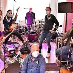 Soundcheck mit Gesichtsmasken auf der Bühne vor der Kinoleinwand am späten Nachmittag.