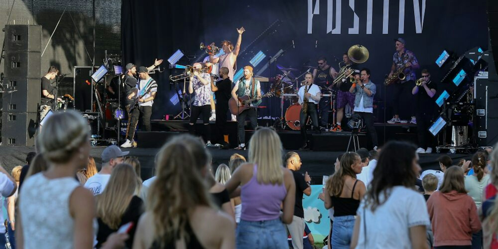 Der Stimmung tut das keinen Abbruch, bis in die 16. Reihe sind alle weißen Vierecke besetzt und die 1000 Konzertgänger tanzen in der prallen Sonne zur Blasmusik. Als „Radikal positiv“ könnte man die Stimmung unter dem wolkenlosen Himmel beschreiben, das neue Album der Band, das kommende Woche erscheint, heißt genauso und will trotz Corona Hoffnung vermitteln.