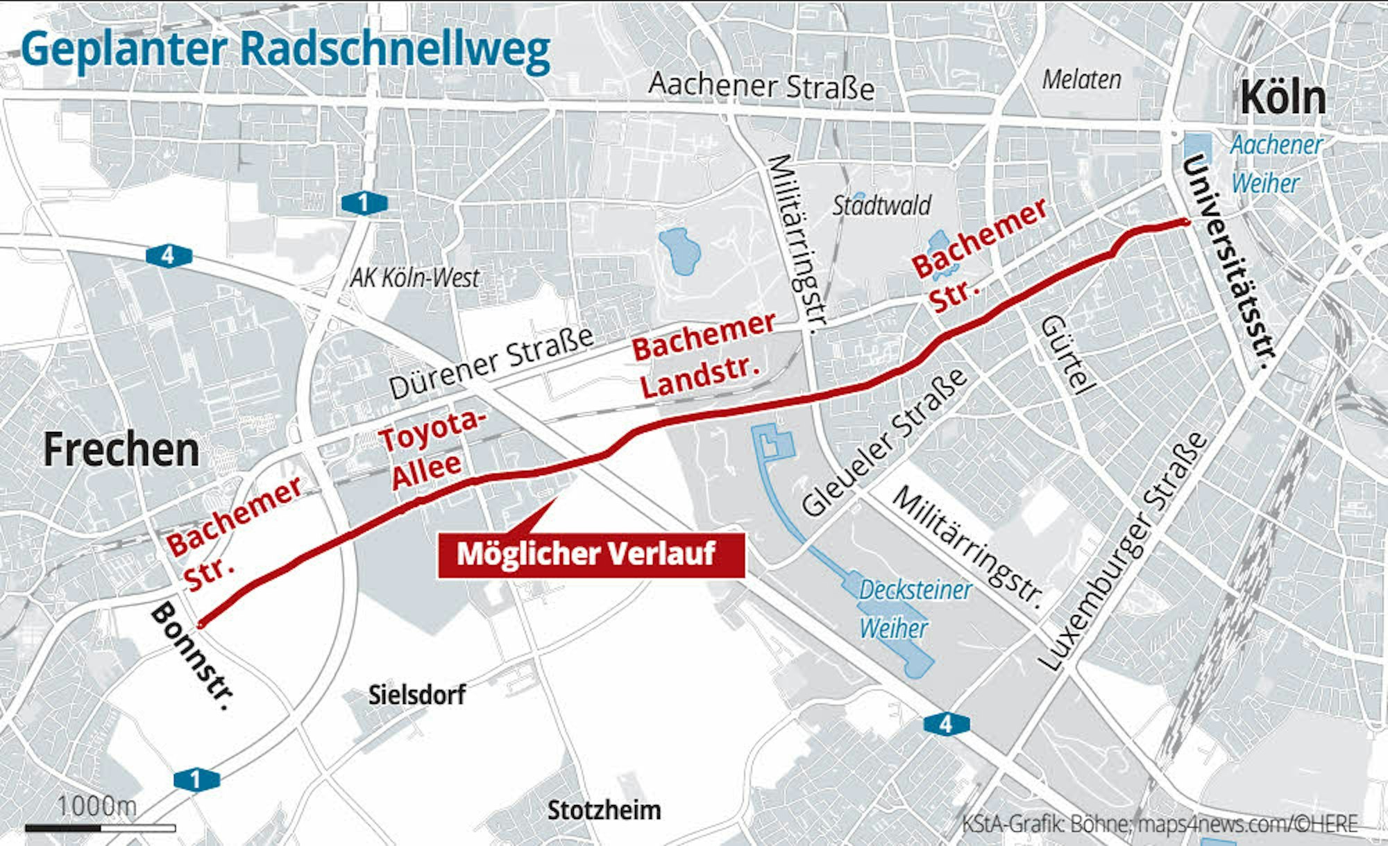 Jenseits davon ergeben sich auch bei der Planung der Route, die grundsätzlich entlang der Bachemer Straße und der Bachemer Landstraße führen wird, Schwierigkeiten. So liegt ein längere Abschnitt im denkmalgeschützten Äußeren Grüngürtel. Der Radschnellweg soll zur Verbesserung der Sicherheit durchgängig beleuchtet sein.