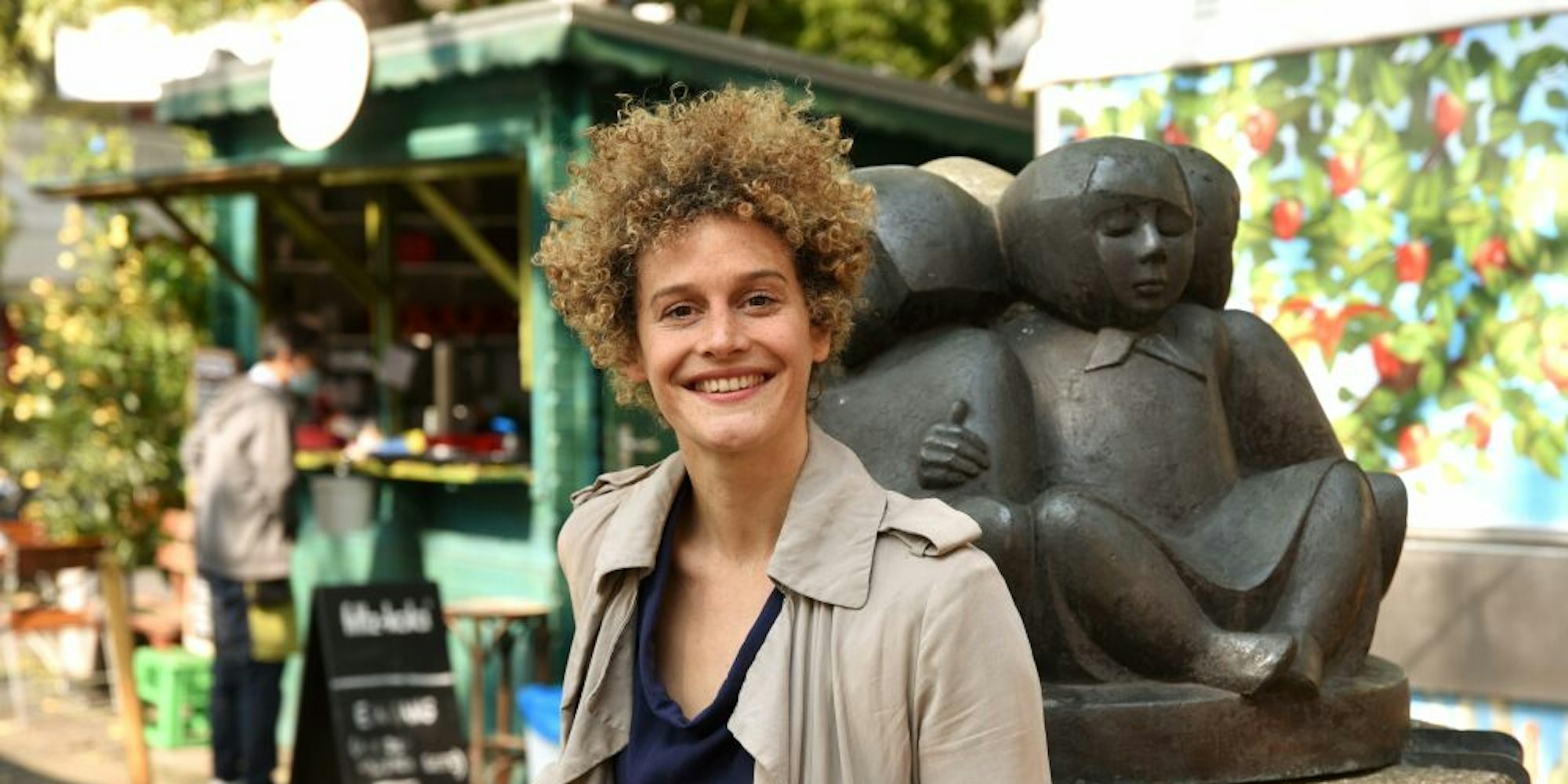 Schauspielerin Karen Dahmen beim Gespräch am Schillplatz in Nippes.