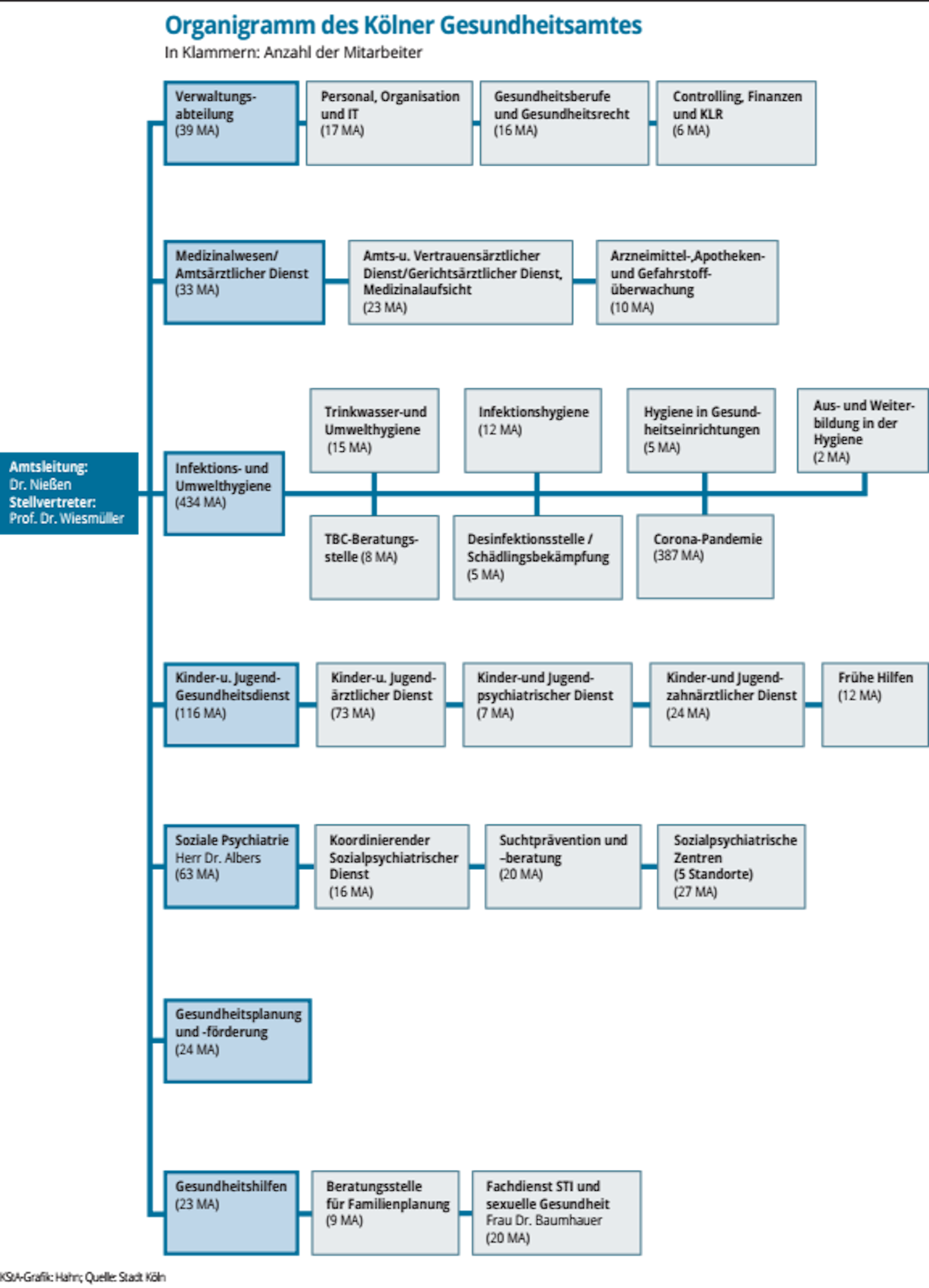 Das größte kommunale Gesundheitsamt befindet sich in Köln. In der Zentrale am Neumarkt und in einigen ausgelagerten Dienststellen arbeiten mehr als 700 Beschäftigte. Ihre Aufgaben sind vielfältig, von der Apothekenaufsicht bis zur Suchthilfe und der Beratungsstelle zur Familienplanung. Jahresbudget: 33 Millionen Euro.