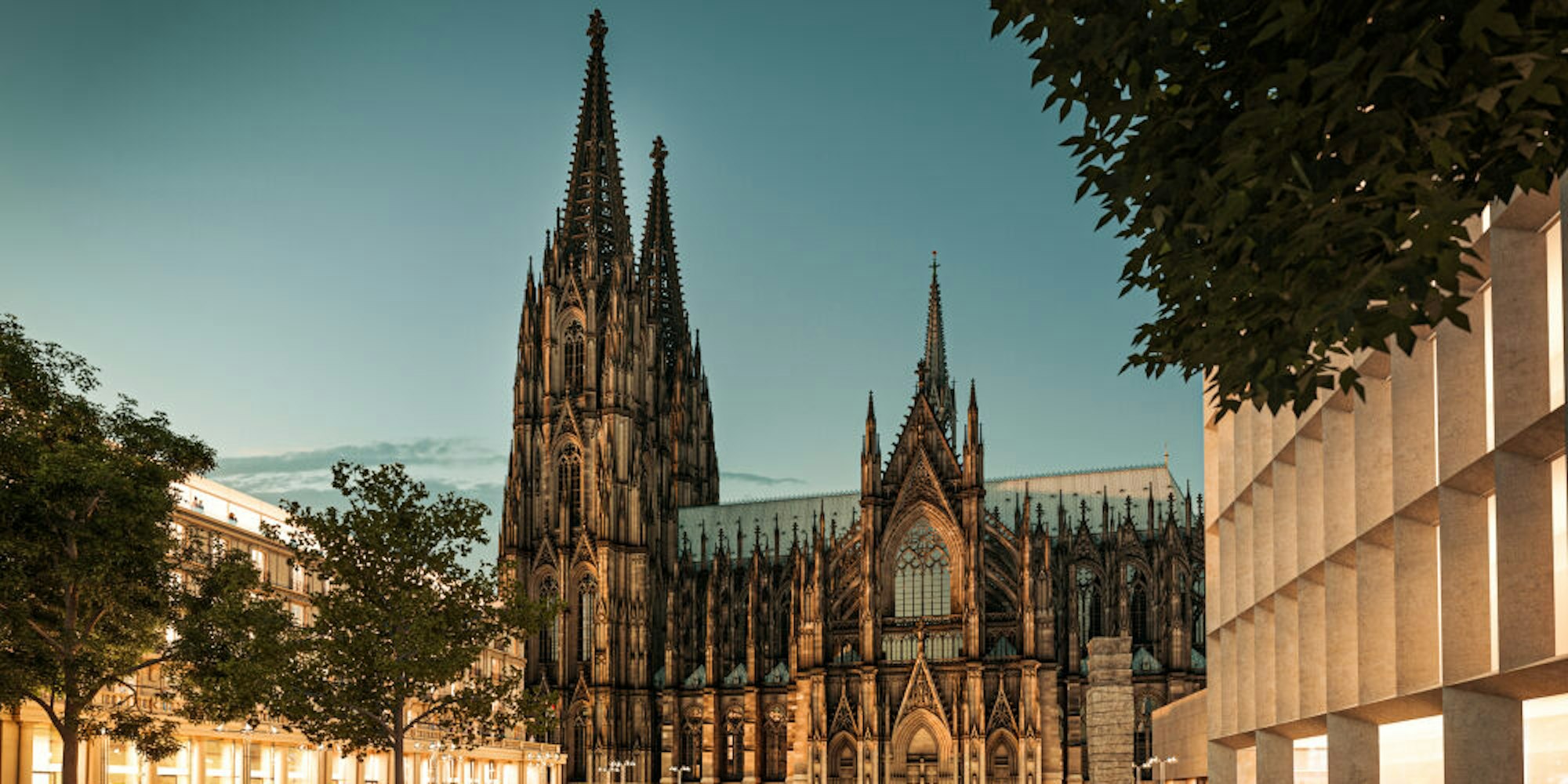 So soll es einmal aussehen: Der Roncalliplatz mit dem fertigen Domhotel (links) und dem neuen Stadtmuseum („Historische Mitte“) rechts.