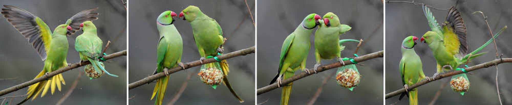 Futterneid bei Halsbandsittichen: großes Gezeter bei einem streitenden Pärchen