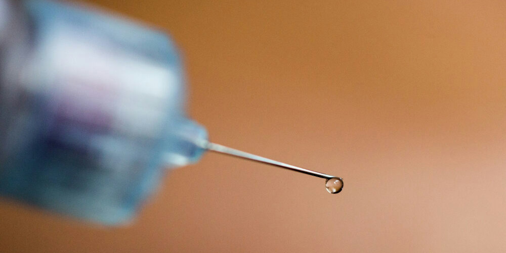 Ein Tropfen Insulin an der Nadel einer Spritze.