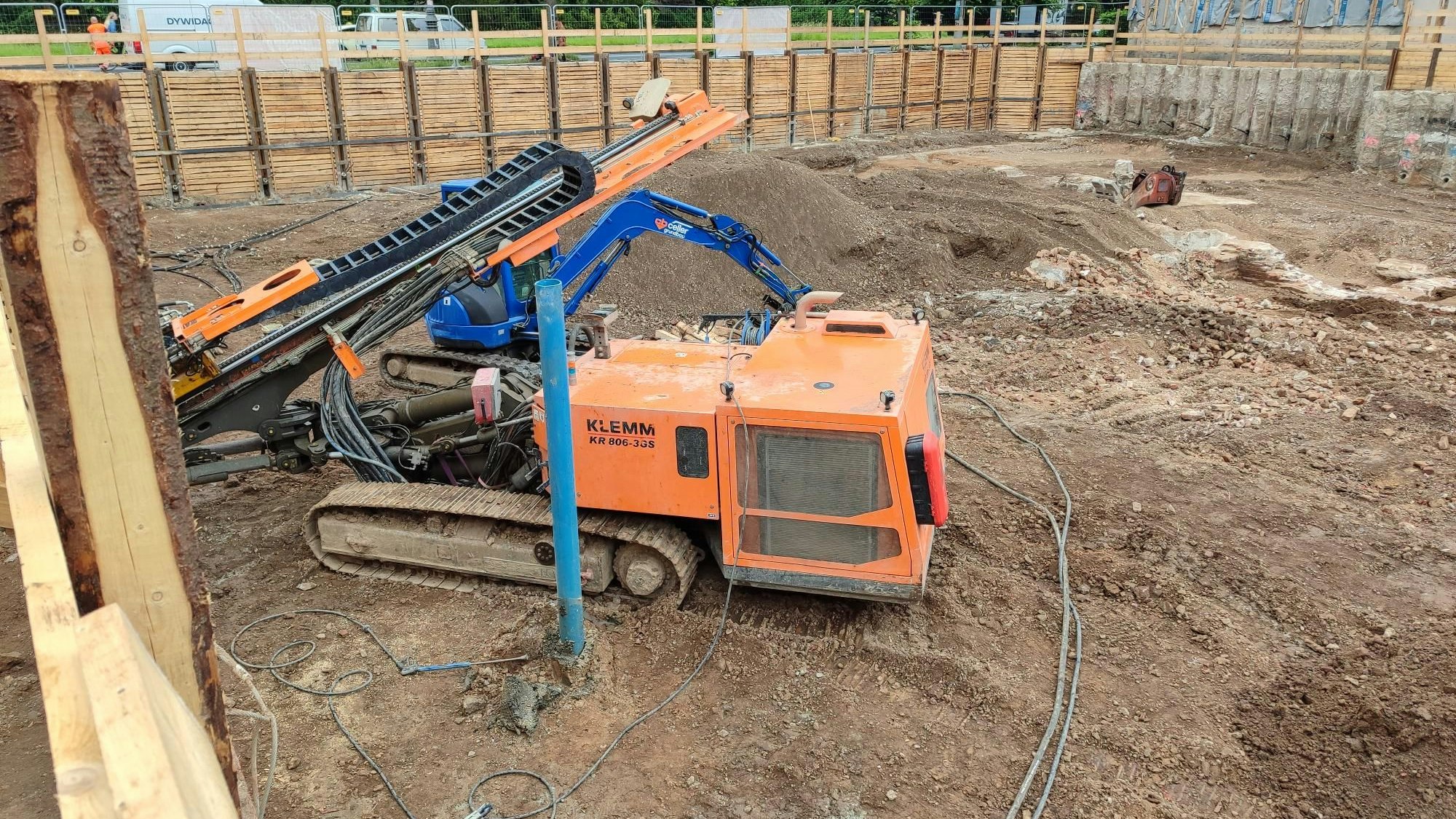 Blick auf die Baustelle am Dienstagmorgen: Ein Kettenbagger steht in einem Erdloch.