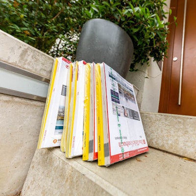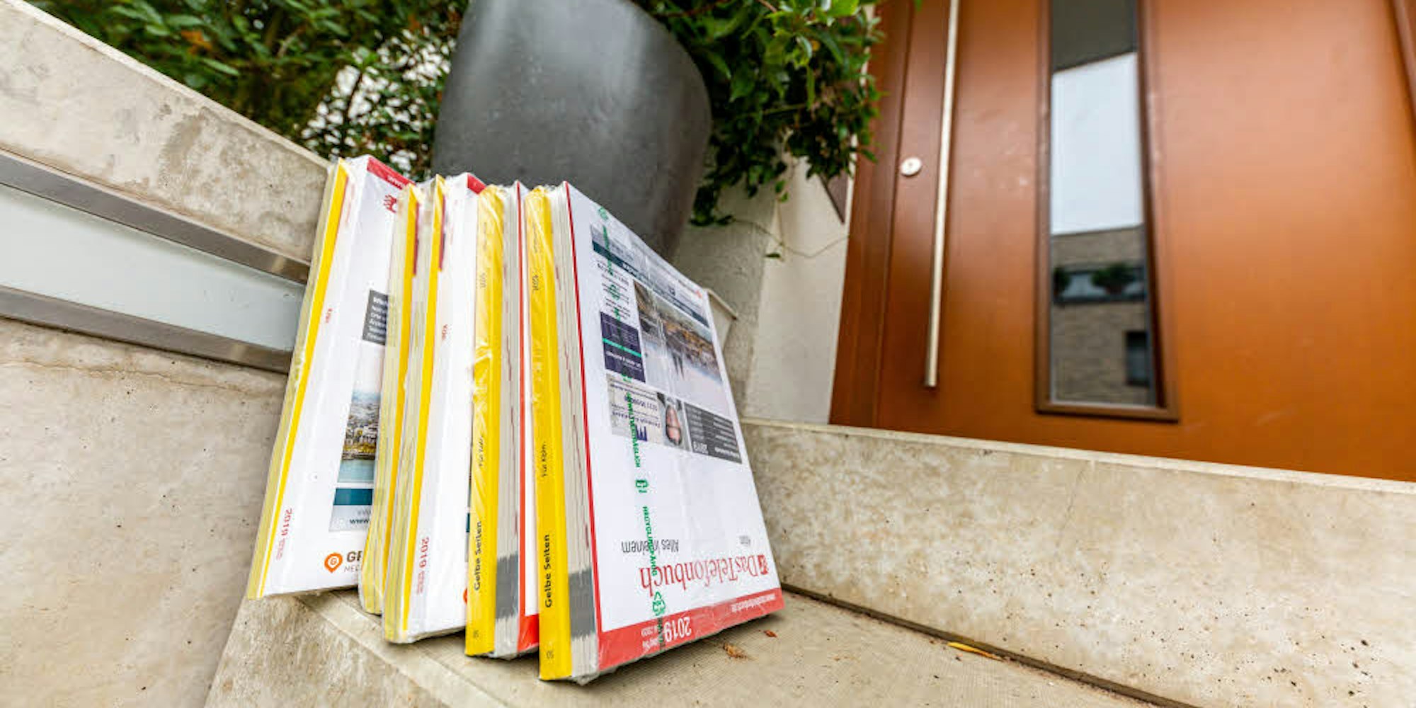 Telefonbücher vor einer Haustür in Köln