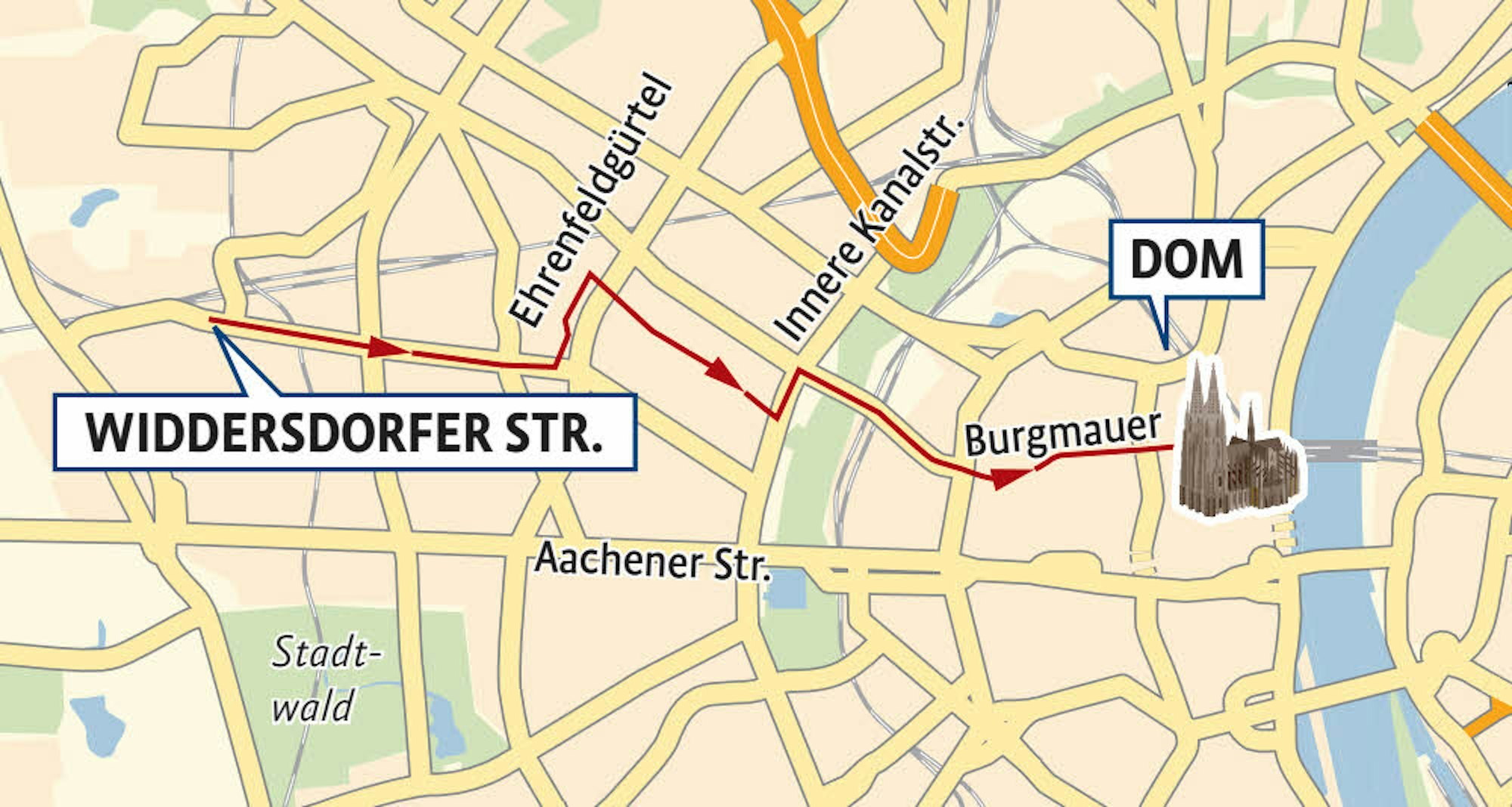 Der Weg von der Widdersdorfer Str. bis zum Dom