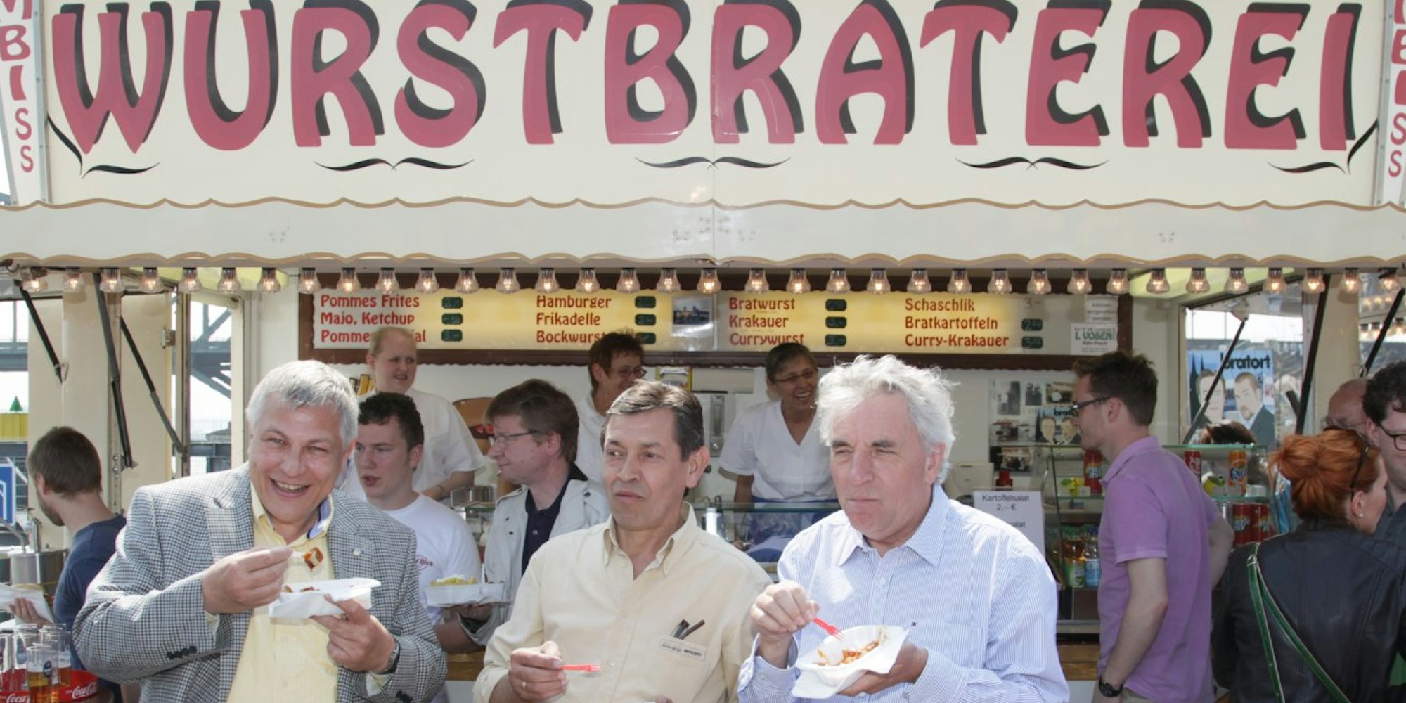Köln – Normalerweise plaudern die beiden Kölner Tatort-Kommissare Max Ballauf (Klaus J. Behrendt) und Freddy Schenk (Dietmar Bär) an der Bratwurstbude über ihre gelösten Fälle, diesmal griffen Oberbürgermeister Jürgen Roters, Hafen-Chef Franz-Xaver Corneth und Imbissbuden-Besitzer Ralf Jäger zu Currywurst. Der legendäre Bratwurststand, der in der Krimiserie stets unterhalb der Deutzer Brücke am Rheinufer aufgestellt wird, hat seit dem Wochenende einen neuen Bratort gefunden. Die Imbissbude steht nun im südlichen Bereich des Rheinauhafengeländes - neben dem Skater-Gelände zwischen Südbrücke und Kap am Südkai.