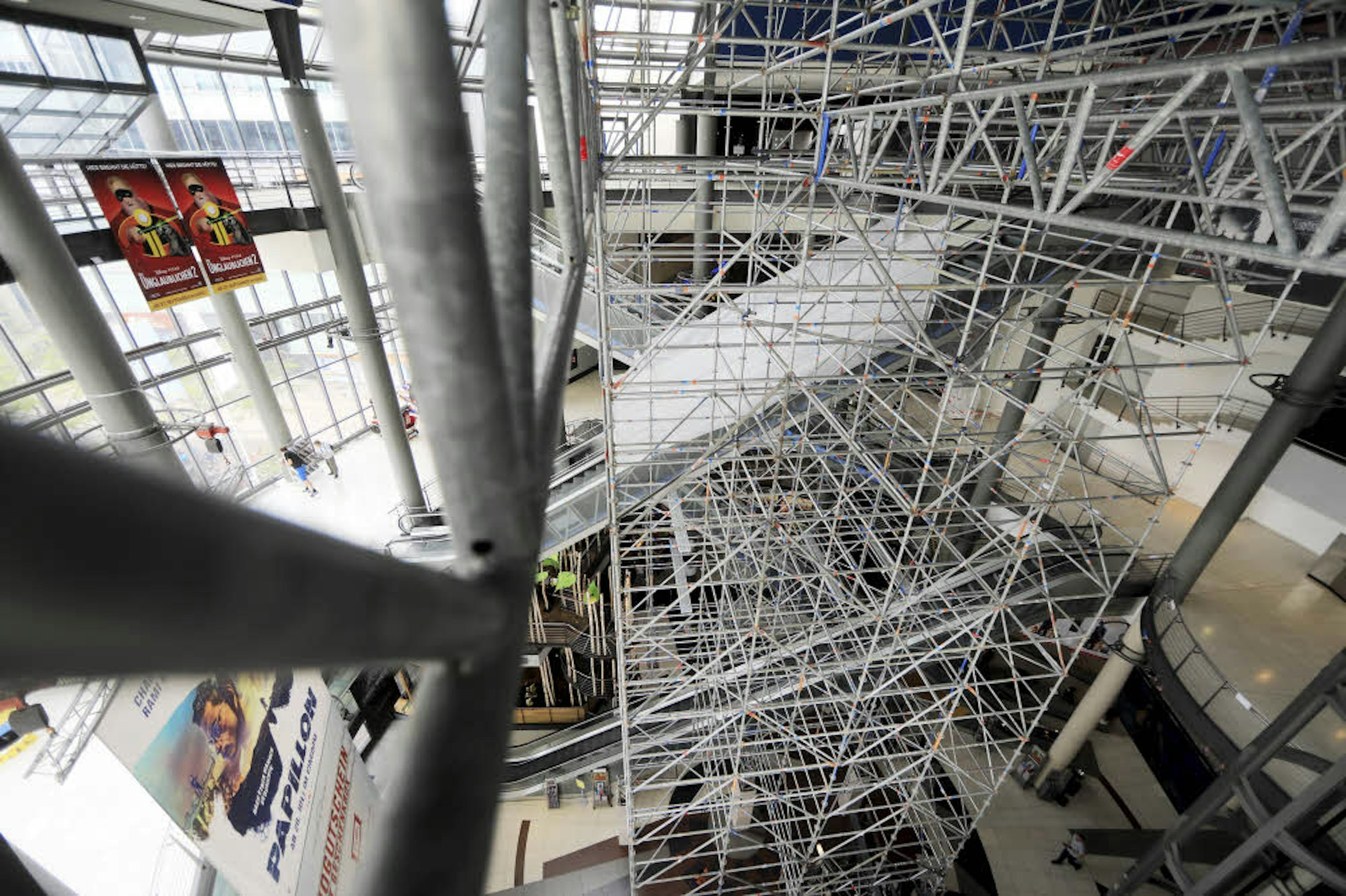 Ein 35 Meter hohes Gerüst wird im Cinedom aufgebaut, um die Kuppel neu zu gestalten.