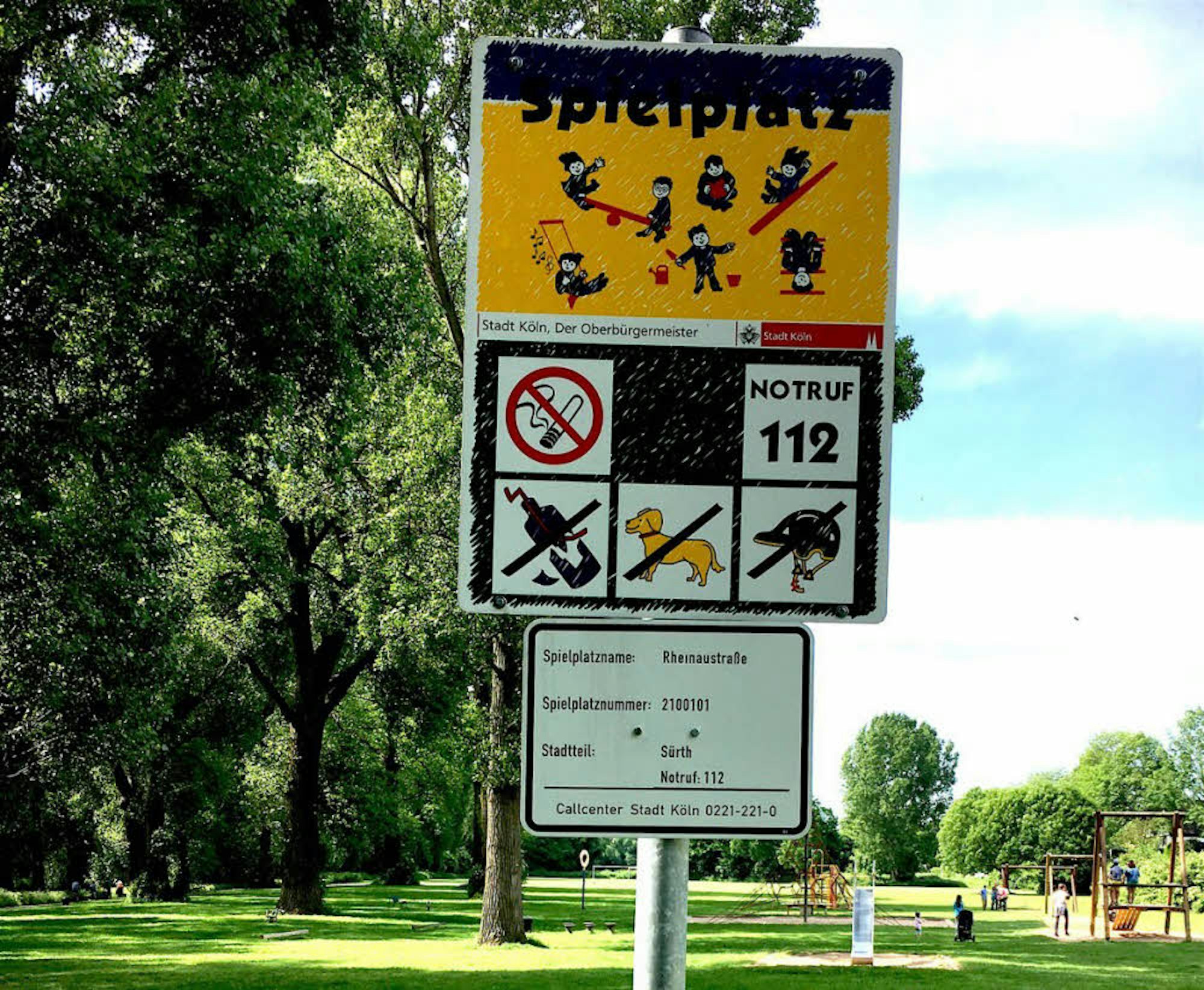 Hinweisschild auf dem Spielplatz am Ufer in Sürth