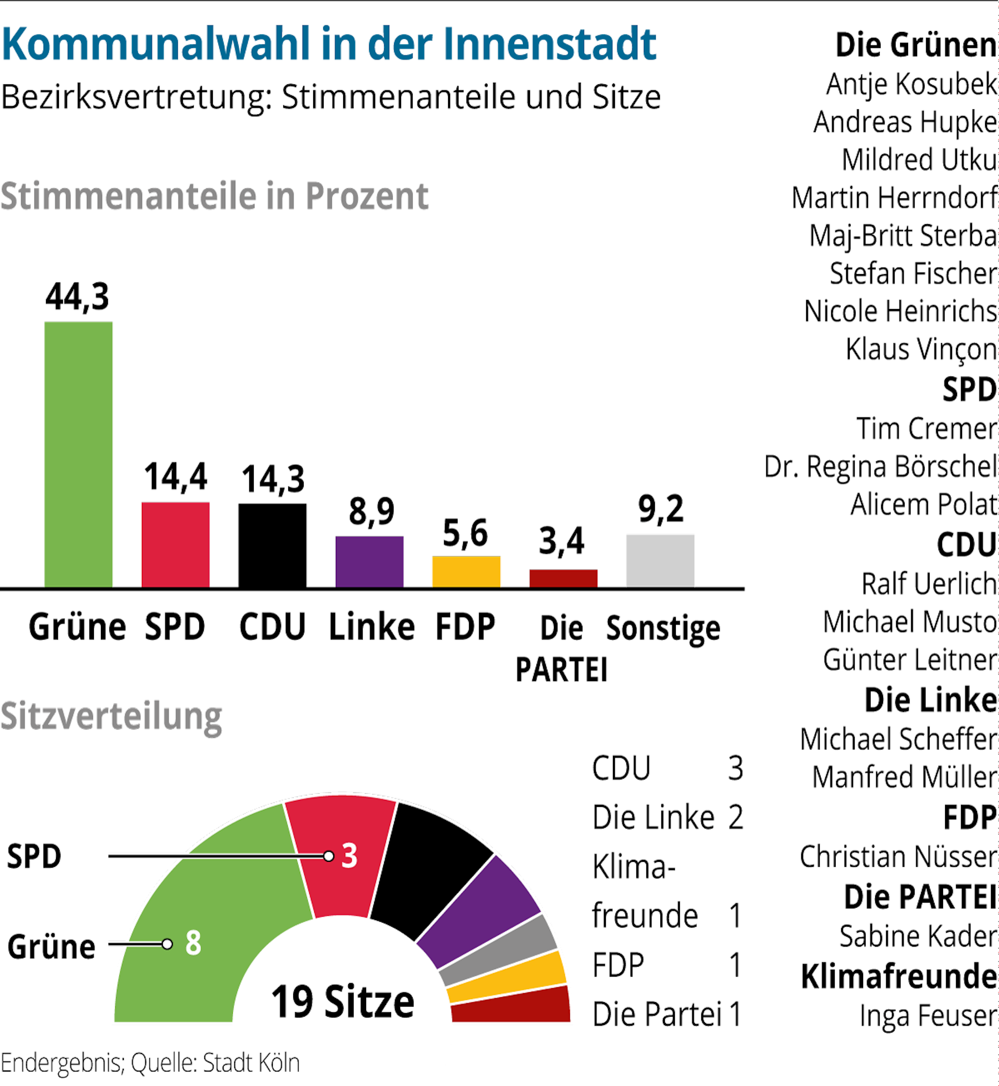 Köln – Eigentlich sind solche Ergebnisse in einer sich immer mehr zersplitternden Parteienlandschaft nicht mehr denkbar: Fast 45 Prozent für eine Partei und 30 Prozentpunkte Vorsprung vor der Zweitplatzierten – das gibt es noch nicht einmal in einer CSU-geführten bayrischen Stadt. Wohl aber in der Kölner Innenstadt.