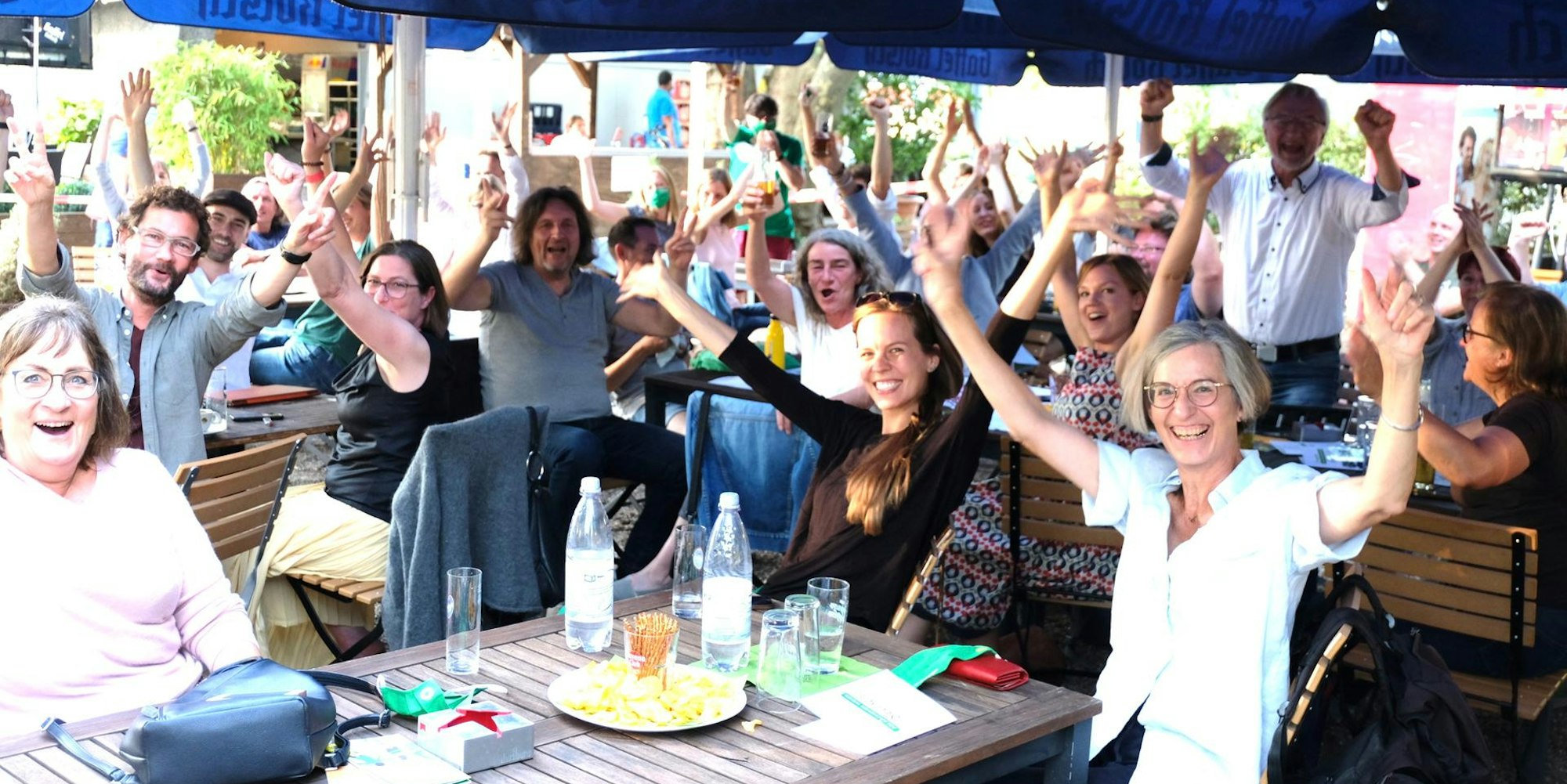 Bezirksbürgermeister Andreas Hupke (hinten rechts) jubelt mit Parteifreunden im Biergarten am Aachener Weiher