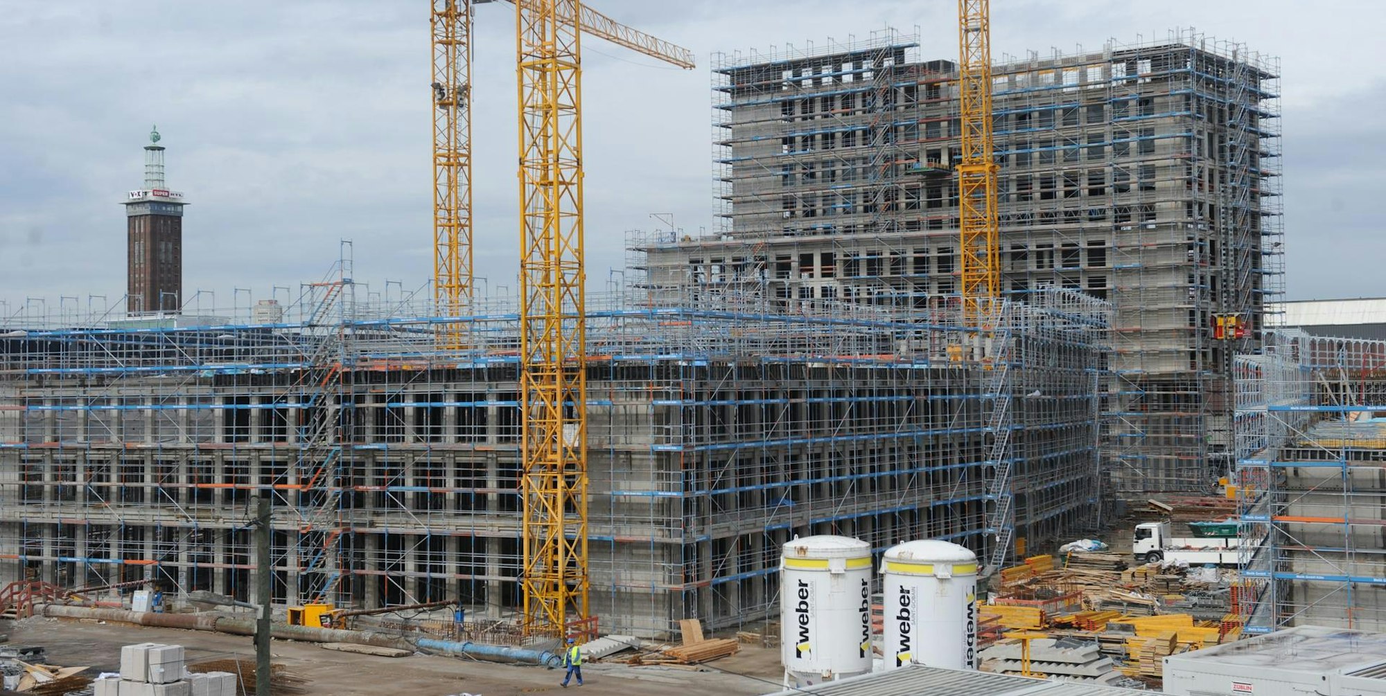 Köln-Deutz – Es geht voran auf einer der größten Baustellen in der Stadt, der Messe-City in Deutz. Nördlich des Bahnhofs streben die ersten Rohbauten ihrer endgültigen Höhe entgegen.