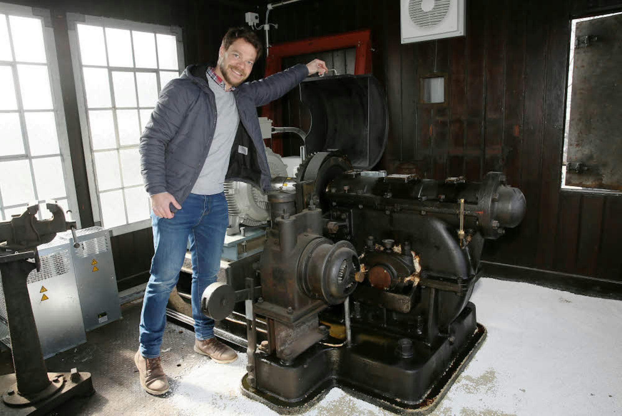 Projektleiter Sebastian Neumann zeigt den Brückenmotor.