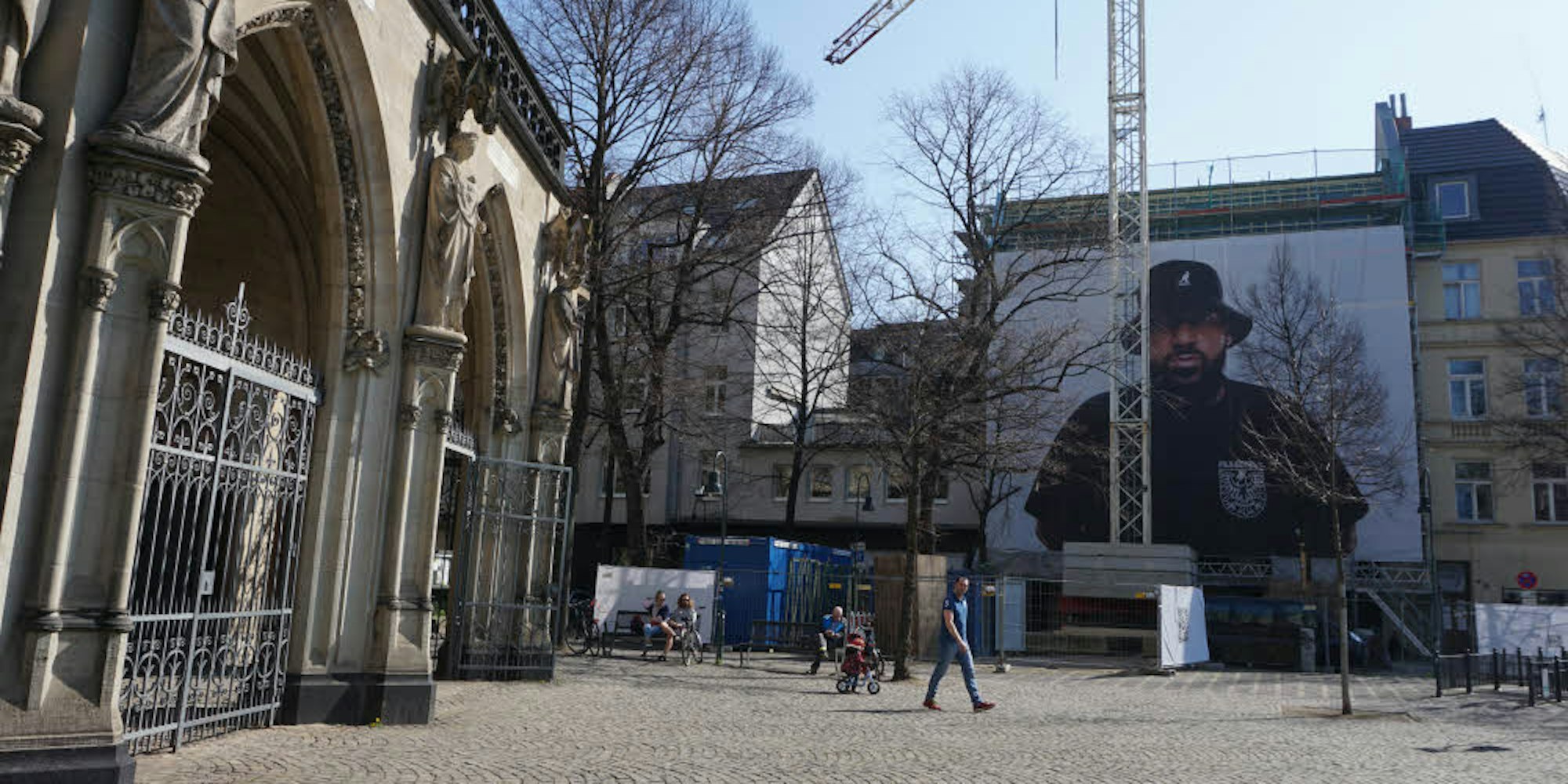 Mühle staunte jedenfalls, als vor knapp zwei Wochen plötzlich wieder ein riesiges Plakat an einer Fassade hing – diesmal sogar direkt neben der Agneskirche am Neusser Platz, mindestens genauso groß. Es zeigte den Frankfurter Rapper Moses Pelham im Großformat. Er habe den Vorfall bei der zuständigen Bauaufsicht gemeldet, dort allerdings keine Rückmeldung erhalten, so Mühle.