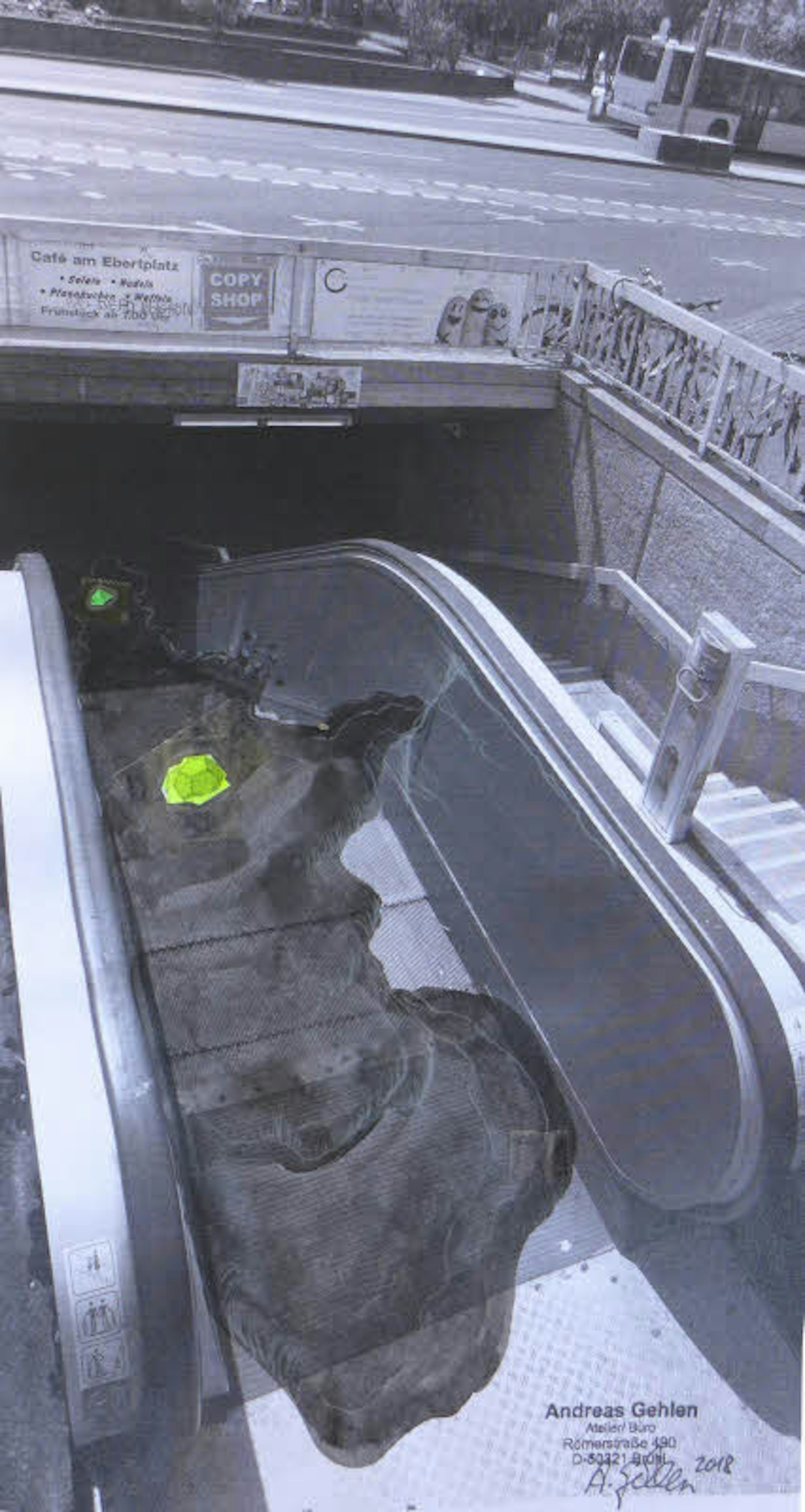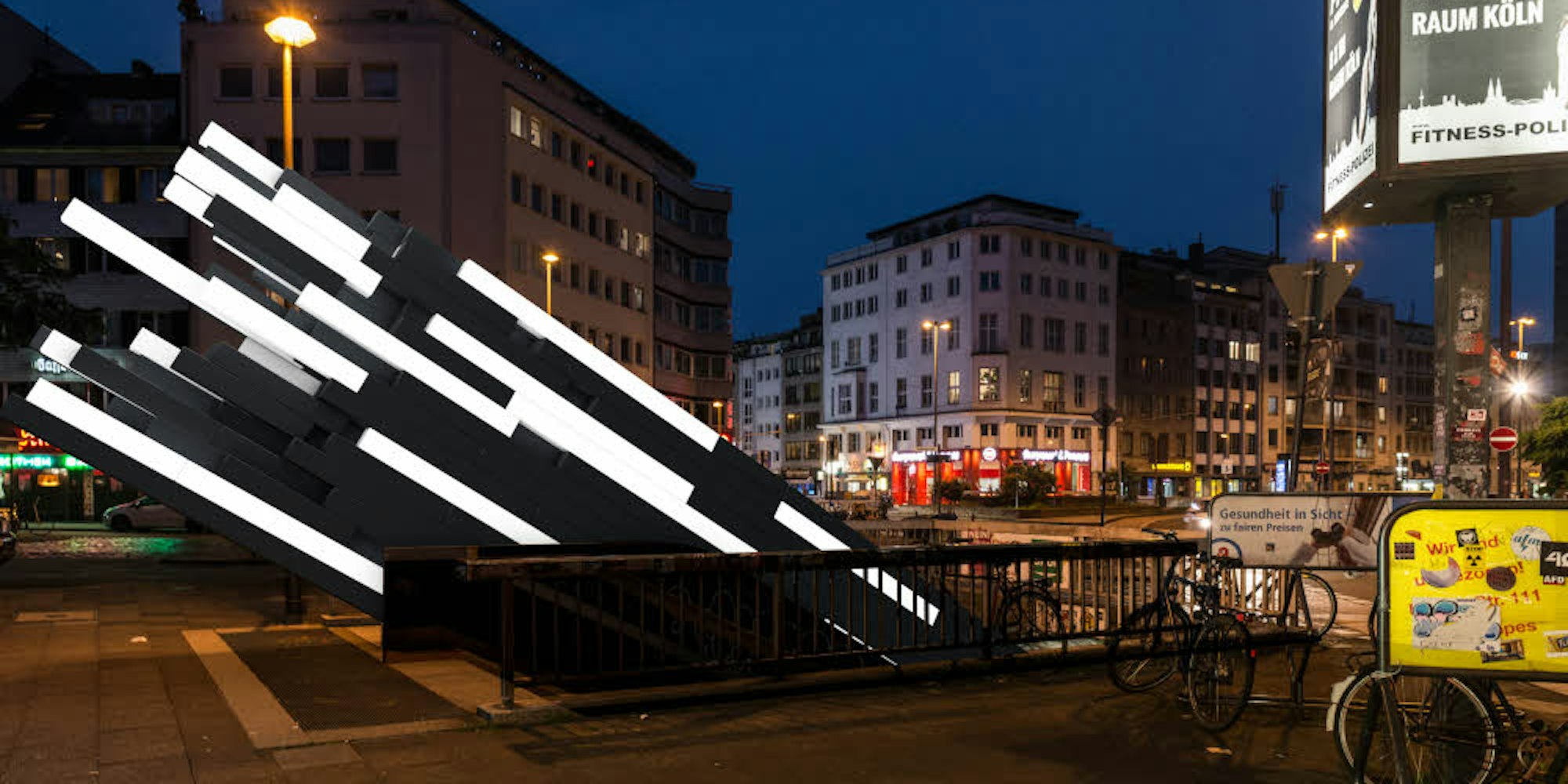 Mit ihrer in den Untergrund strebenden Plastik „Gatecrash“ wollen Sandy Craus und Sebastian Hahn Passanten in die Tiefe des Ebertplatzes ziehen. Das Werk soll Licht und Dynamik in den Tunnel bringen.